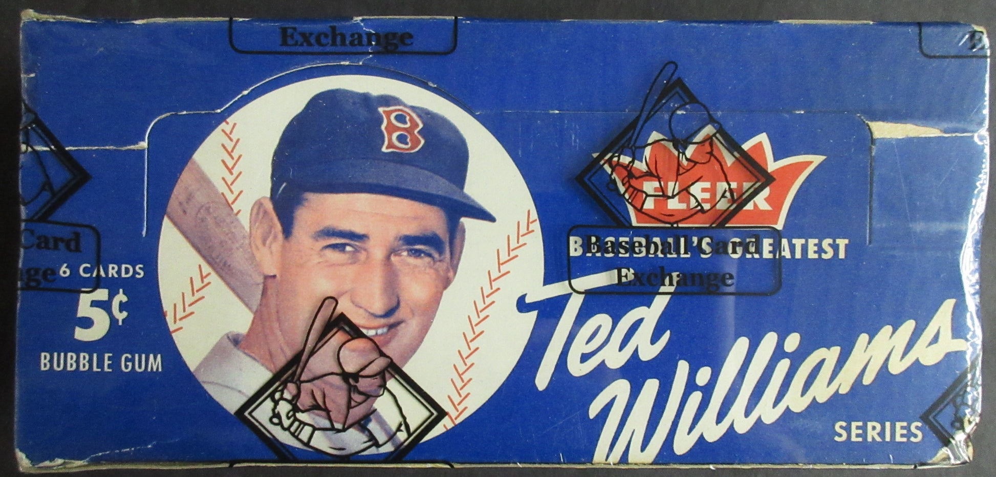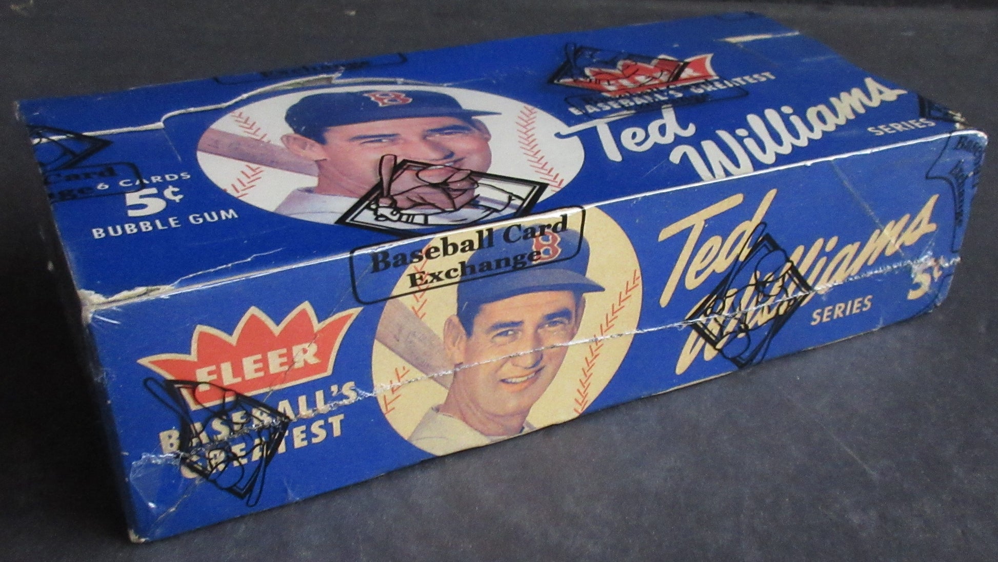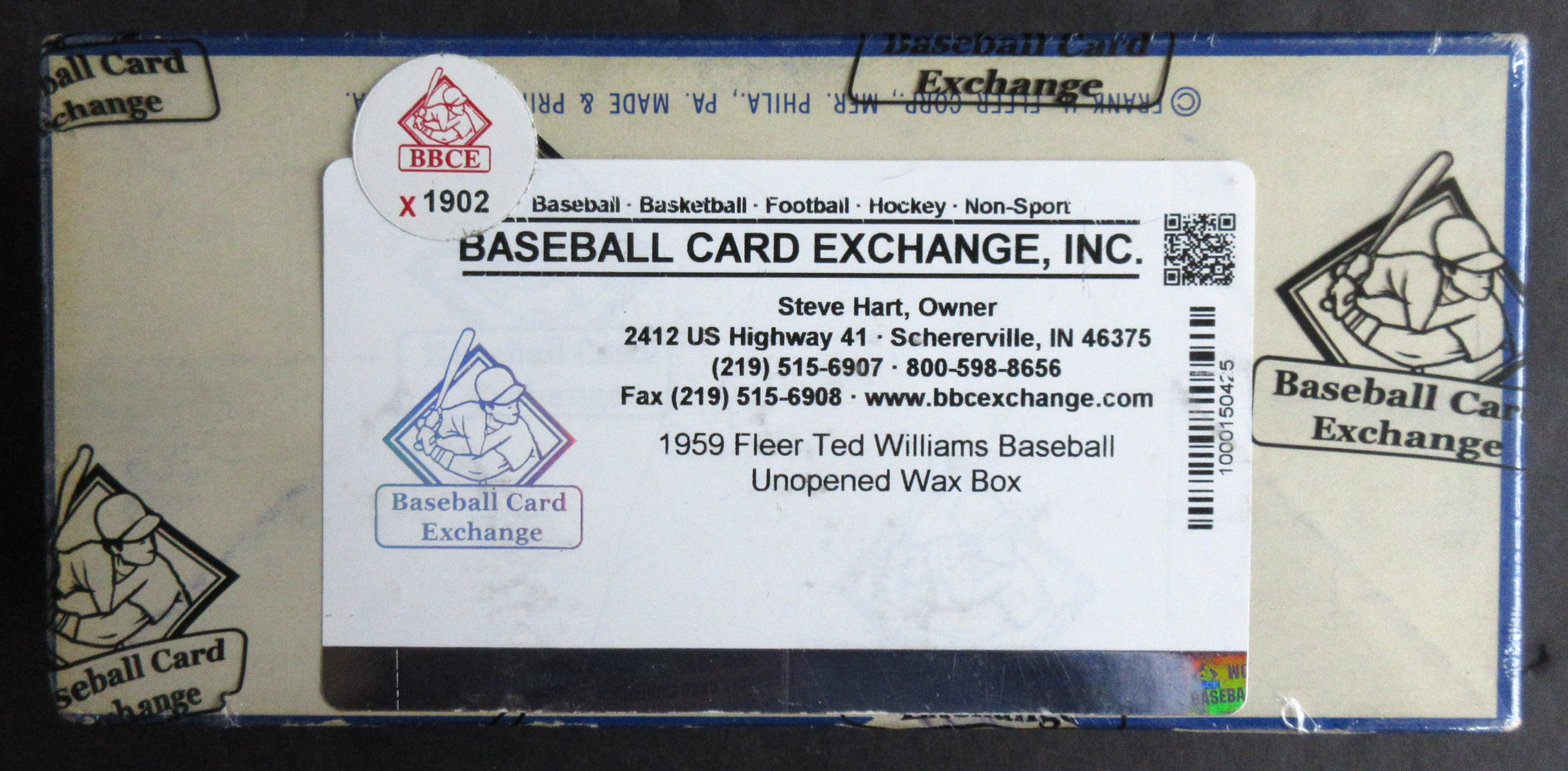 1959 Fleer Ted Williams Baseball Unopened 5 Cent Wax Box (BBCE) (X1902). This box contains (24) 5 Cent wax packs. These are the (6) card packs. This box has been authenticated and wrapped in Baseball Card Exchange shrink wrap.