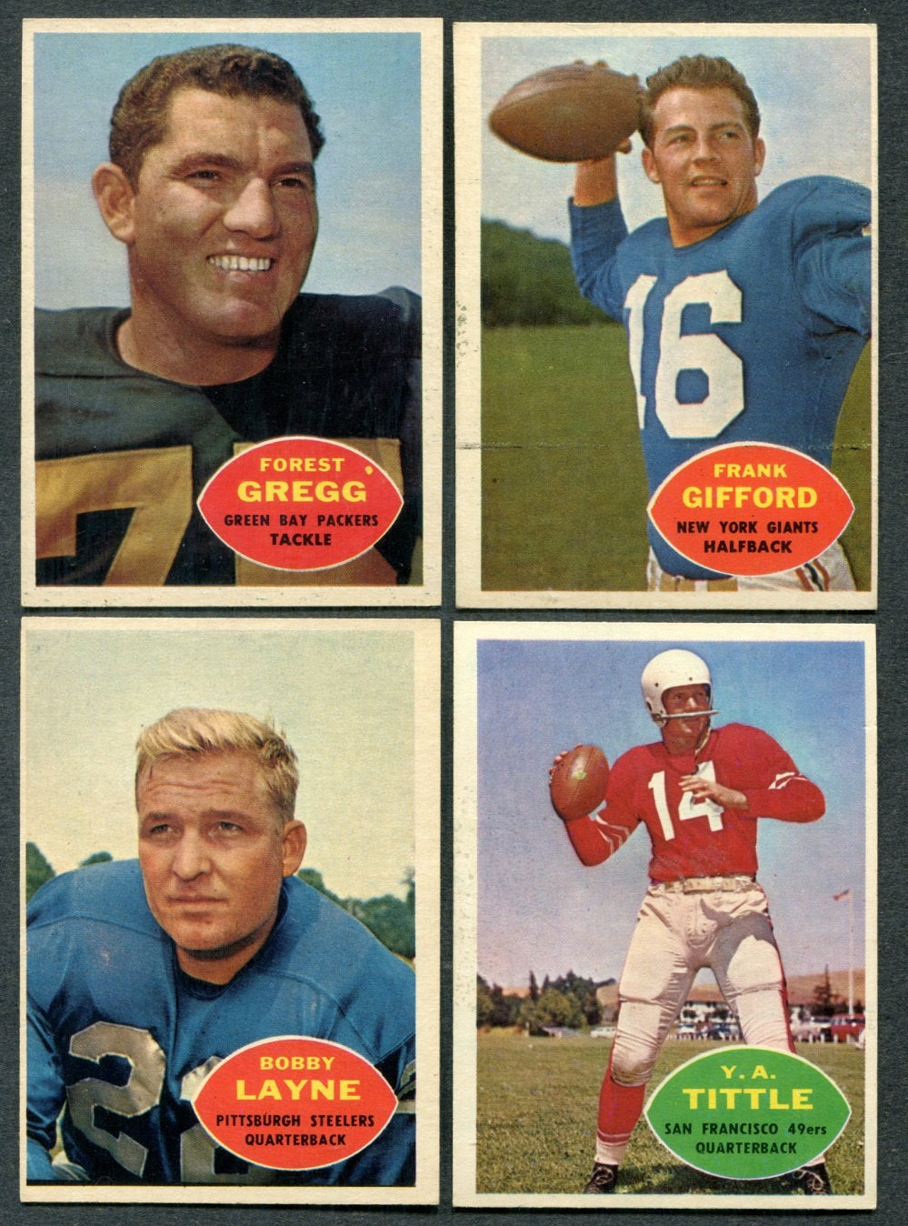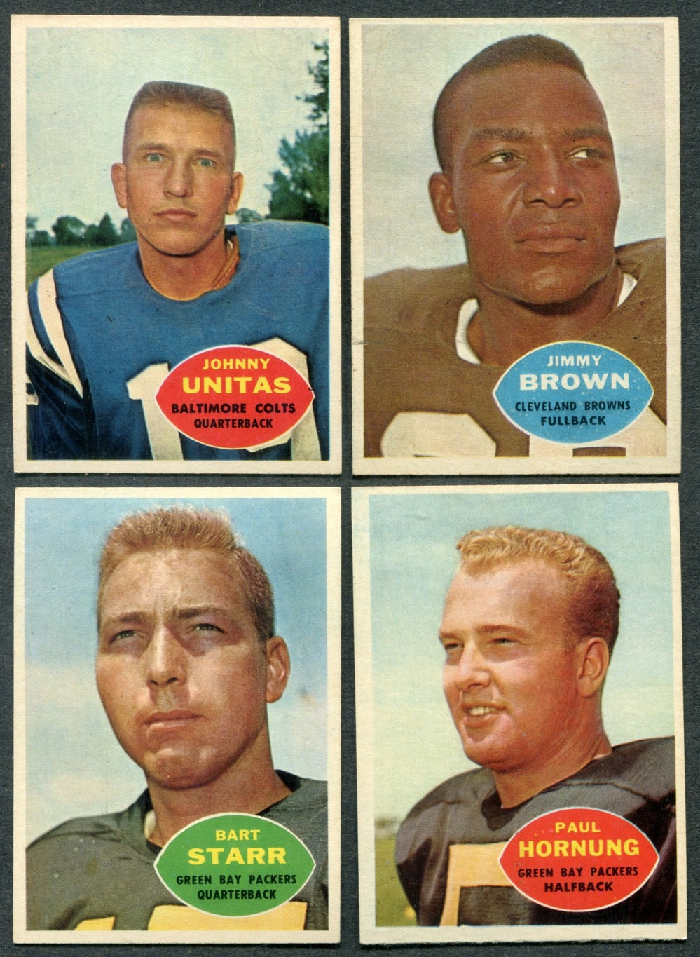 1960 Topps Football Complete Set EX/MT NM (132) (24-577). This complete set of (132) cards has an overall average condition of EX/MT to NM. The cards listed have the following grades: #1 (Unitas) - NM, #23 (Brown) - EX, #51 (Starr) - EX/MT, #54 (Hornung) - EX/MT, #74 (Gifford) - VG/EX, #93 (Layne) - EX, and #113 (Tittle) - NM.