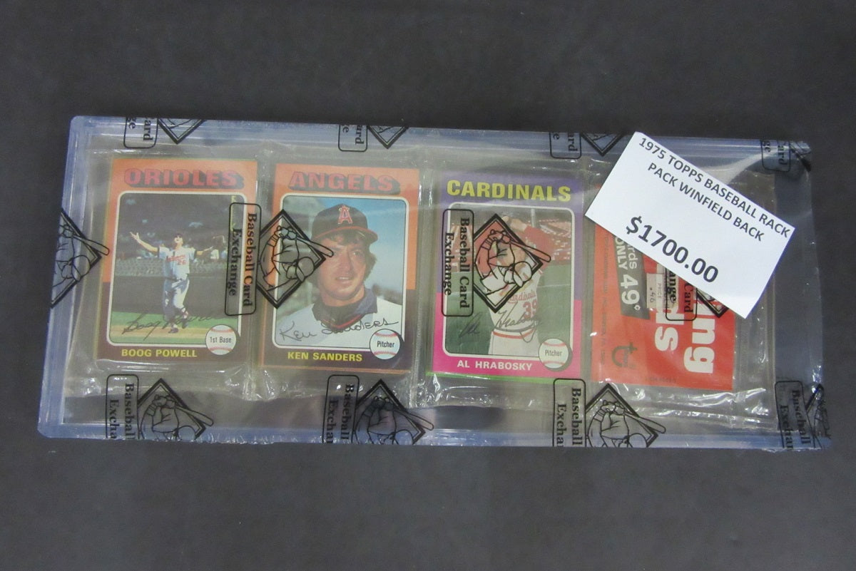 1975 Topps Baseball Unopened RackPack (BBCE) (Winfield Back). This 1975 Topps Baseball Unopened Rack Pack with Dave Winfield showing on Back has been authenticated and wrapped in Baseball Card Exchange shrink wrap.