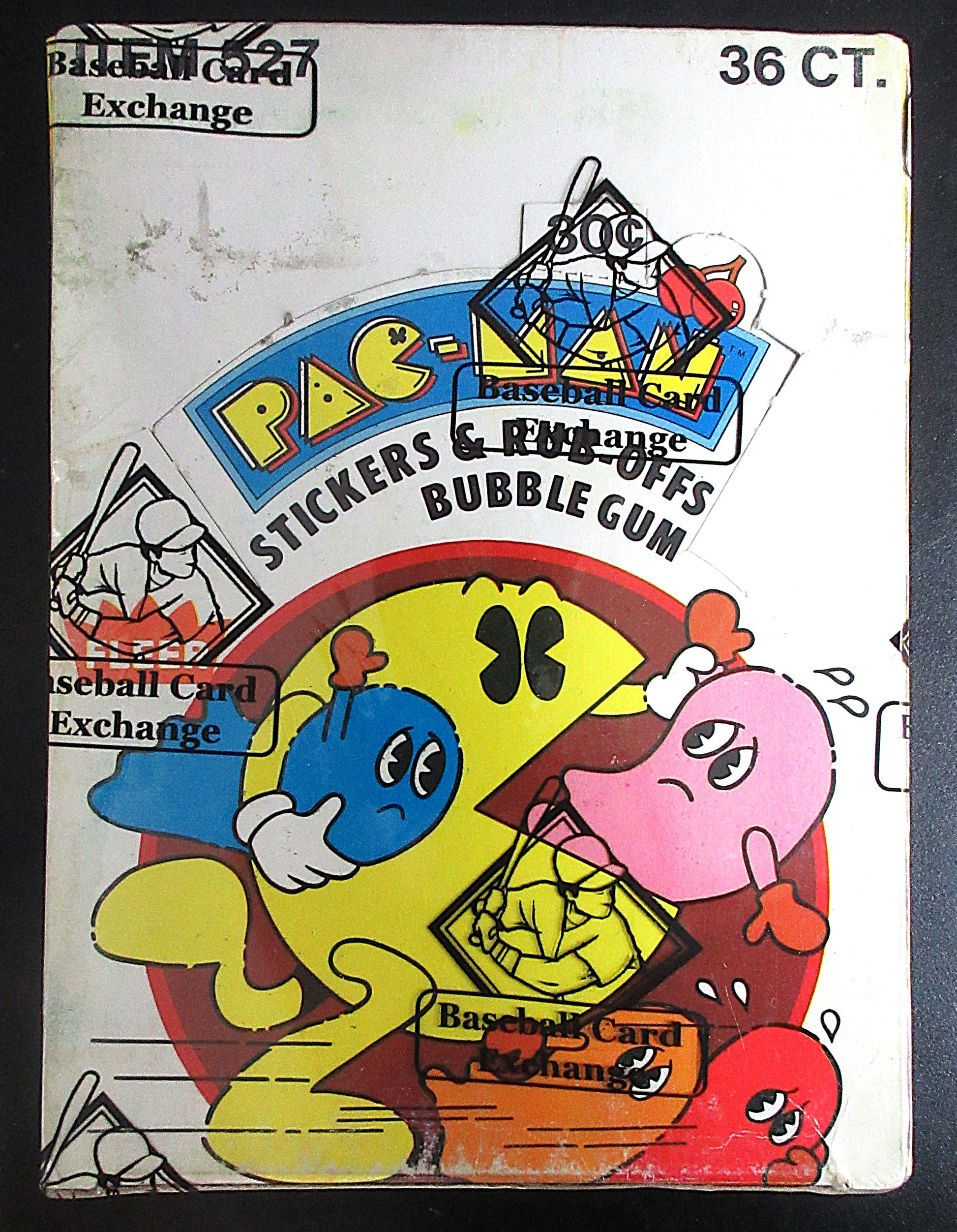 1980 Fleer Pac-Man Unopened Wax Box (BBCE) (Read) (26450). This box contains (36) packs, each with (3) cards and (3) stickers. The box has been authenticated and wrapped in Baseball Card Exchange shrink wrap. The top of this box shows some discoloration and the condition is shown in the pictures.