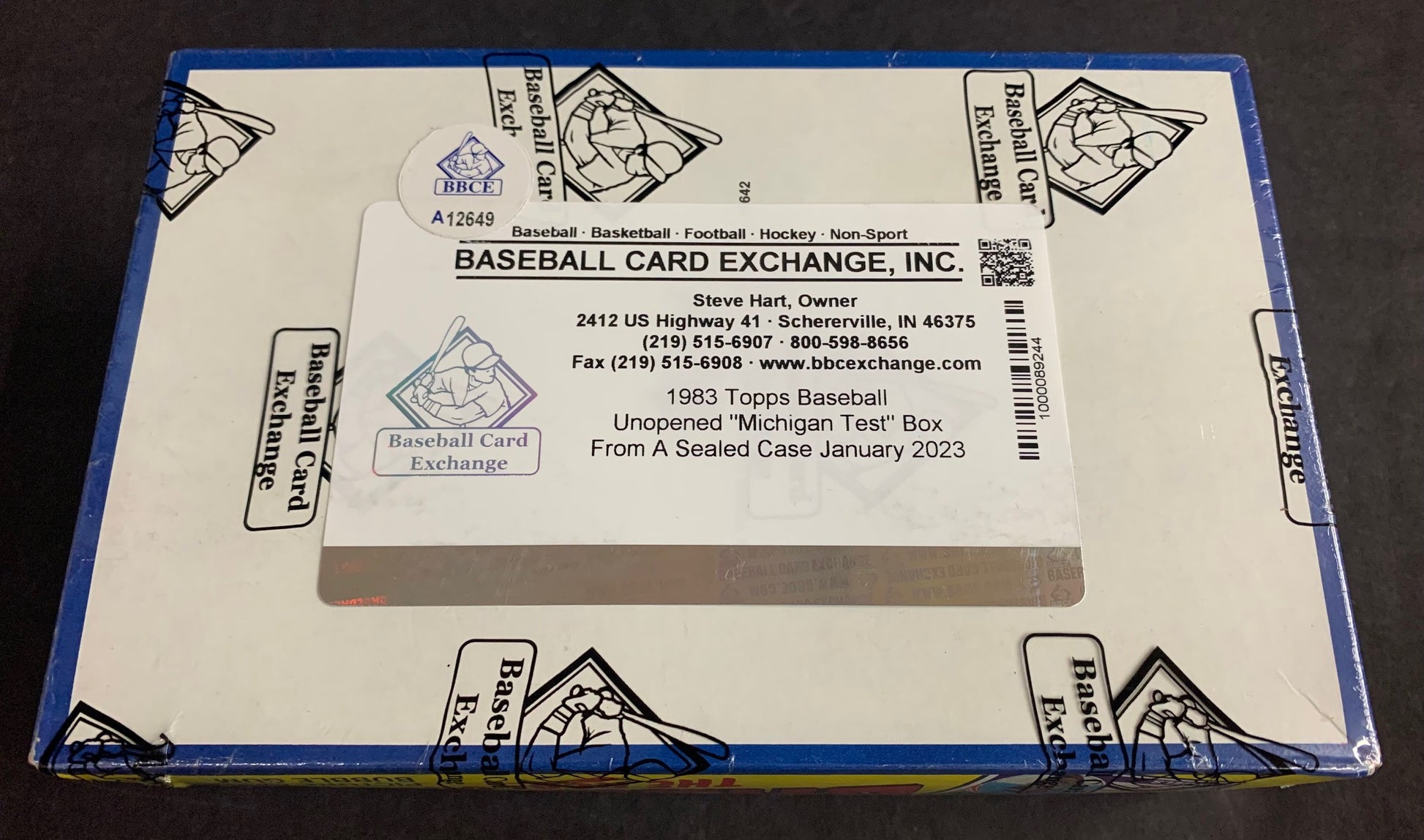1983 Topps Baseball Unopened Michigan Test Box (FASC). This box contains (36) packs. This box has been authenticated as "From A Sealed Case" and wrapped in Baseball Card Exchange shrink wrap.