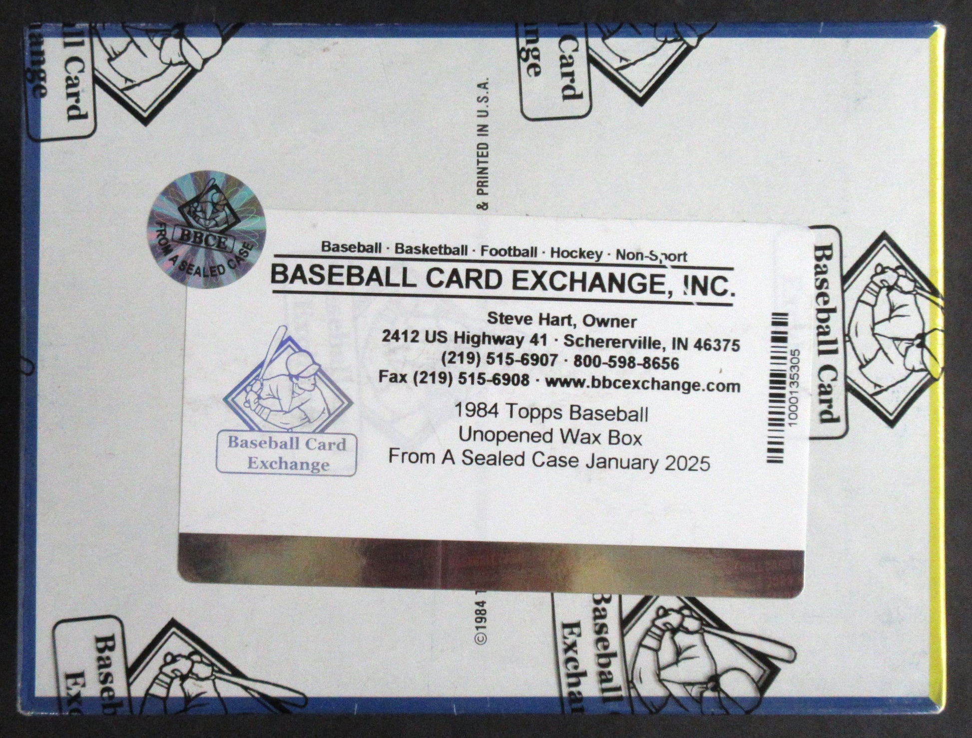 1984 Topps Baseball Unopened Wax Box (FASC). This box box has been authenticated as From A Sealed Case and wrapped in Baseball Card Exchange shrink wrap.