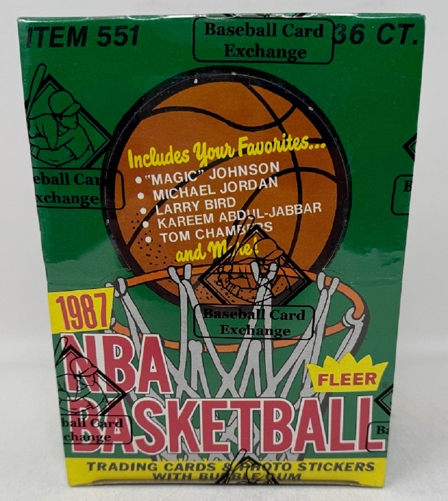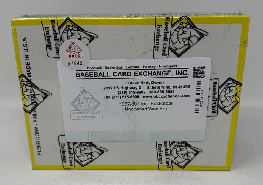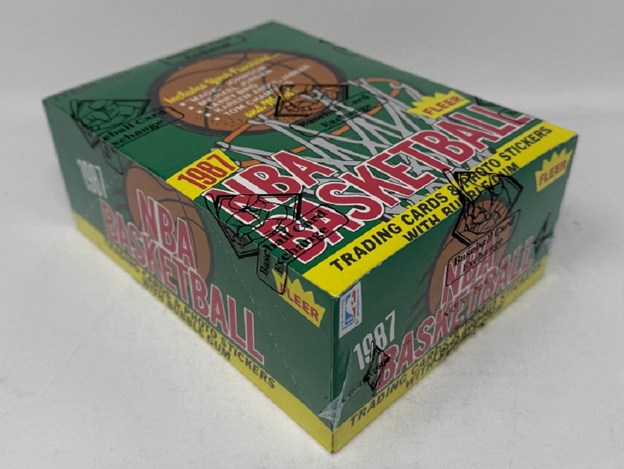 1987 1987/88 Fleer Basketball Unopened Wax Box (BBCE) (X1842). This box contains (36) packs, each with (12) cards and (1) sticker. This box has been authenticated and wrapped in Baseball Card Exchange shrink wrap.