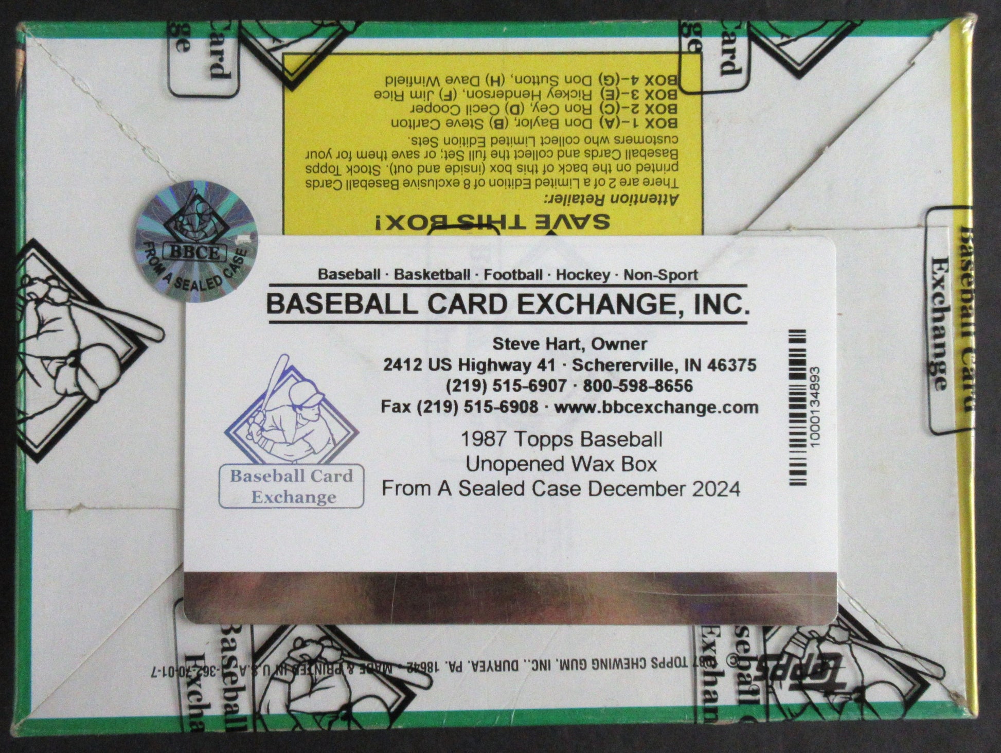 1987 Topps Baseball Unopened Wax Box (FASC). This box box has been authenticated as From A Sealed Case and wrapped in Baseball Card Exchange shrink wrap.