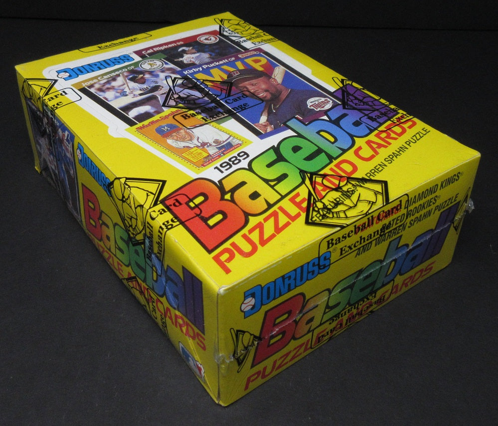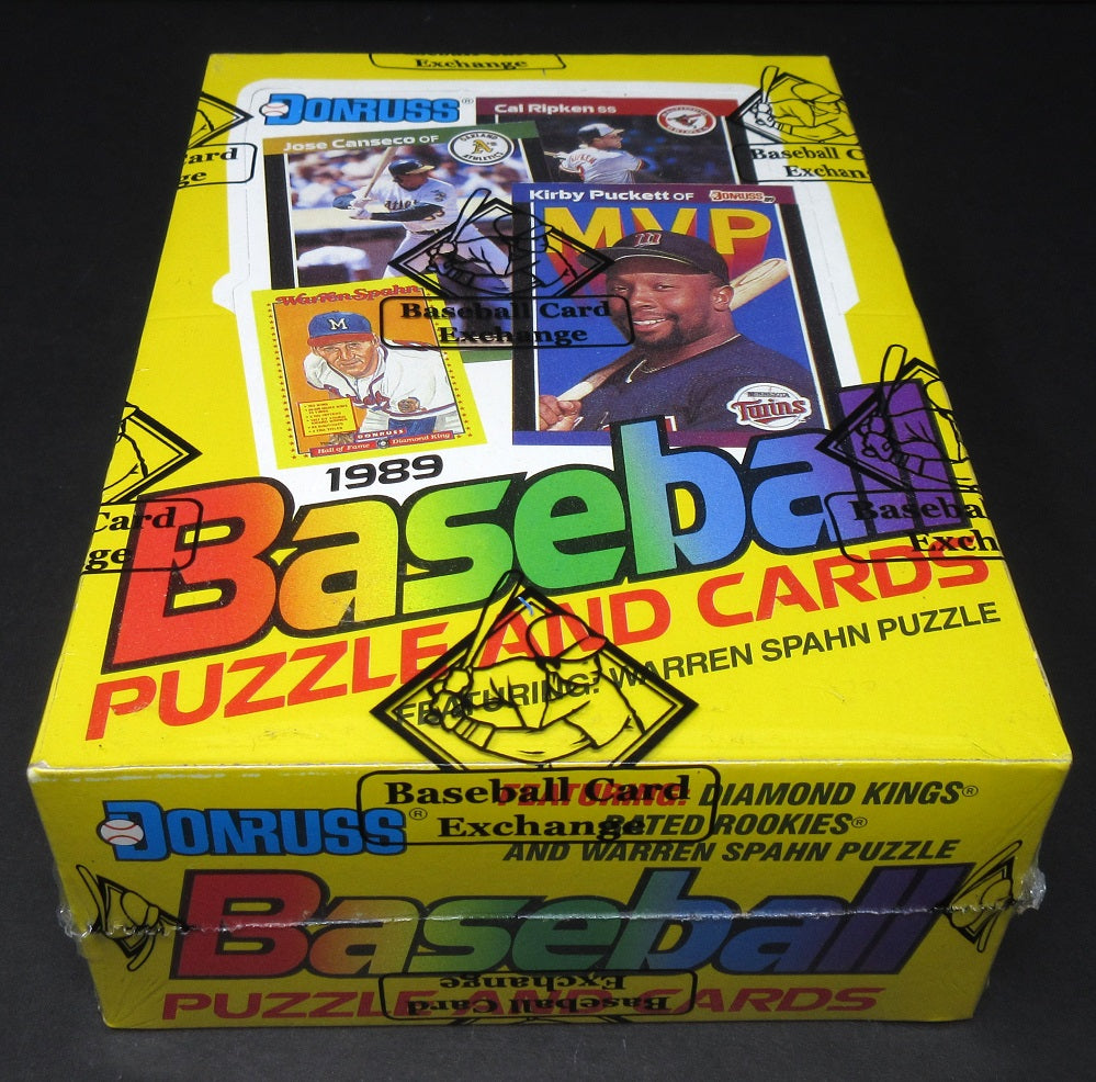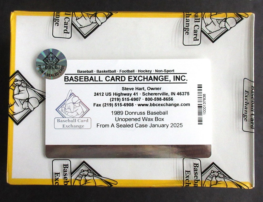 1989 Donruss Baseball Unopened Wax Box (FASC). Box contains 36 unopened wax packs. This box has been authenticated as from a sealed case and wrapped in Baseball Card Exchange shrink wrap.