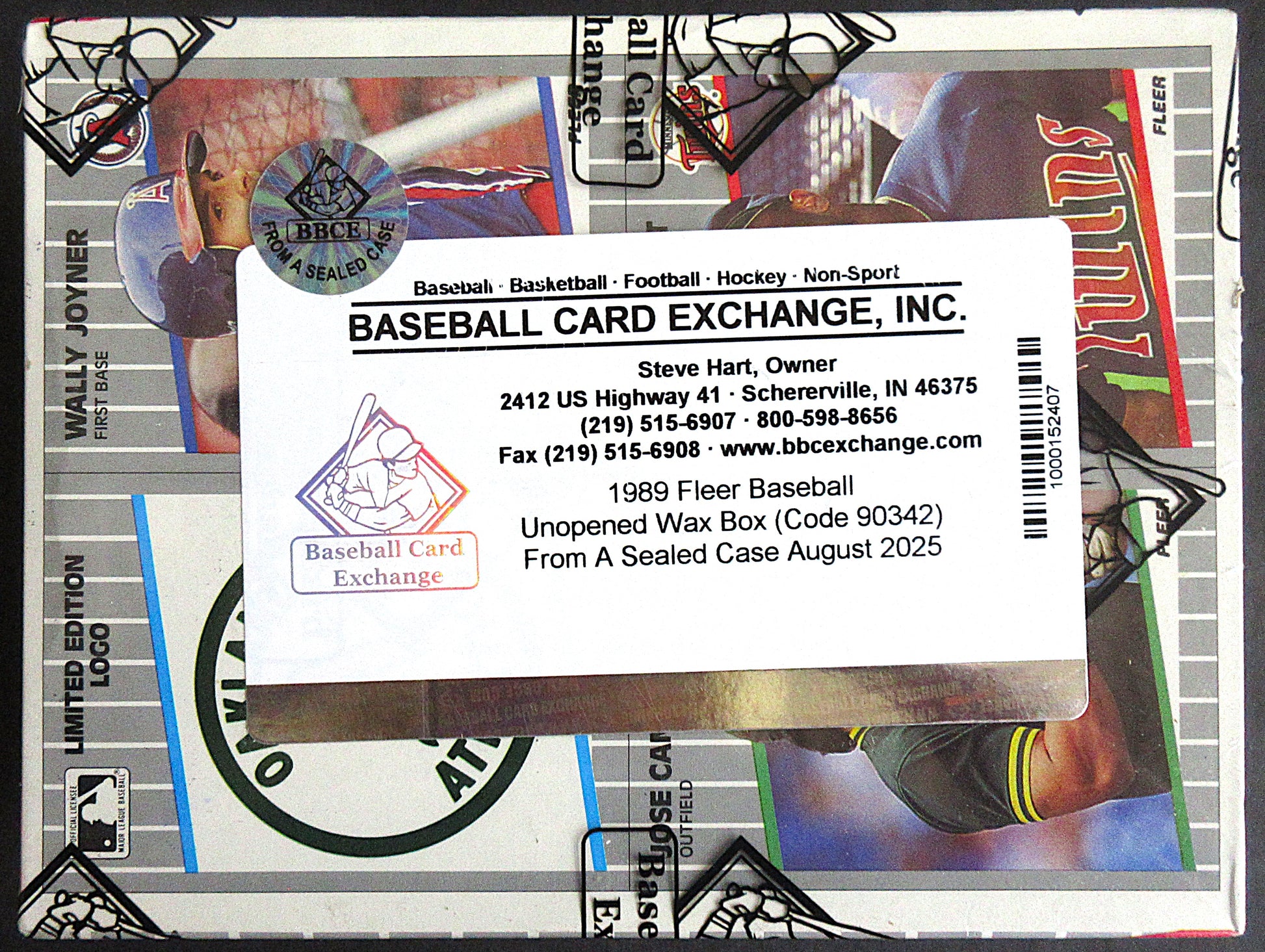 1989 Fleer Baseball Unopened Wax Box (FASC) (Code 90342). 1989 Fleer Baseball Unopened Wax Box (FASC) (Code 90342). This box contains (36) packs, each with (15) cards and (1) sticker. The box has been authenticated as From A Sealed Case (Code 90342) and wrapped in Baseball Card Exchange shrink wrap.