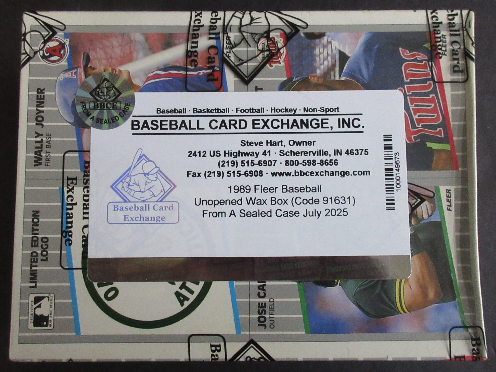 1989 Fleer Baseball Unopened Wax Box (FASC) (Code 91631). This box contains (36) packs, each with (15) cards and (1) sticker. The box has been authenticated as From A Sealed Case (Code 91631) and wrapped in Baseball Card Exchange shrink wrap.