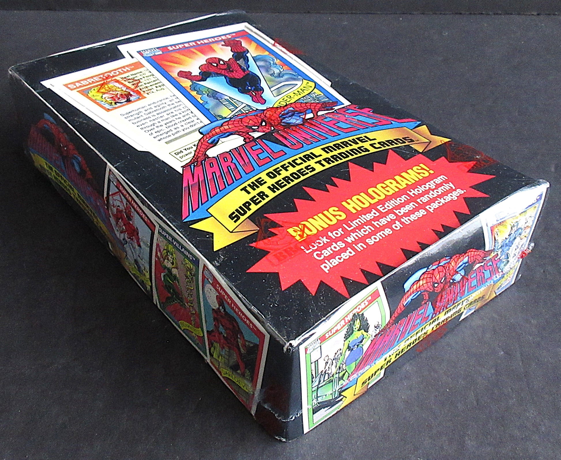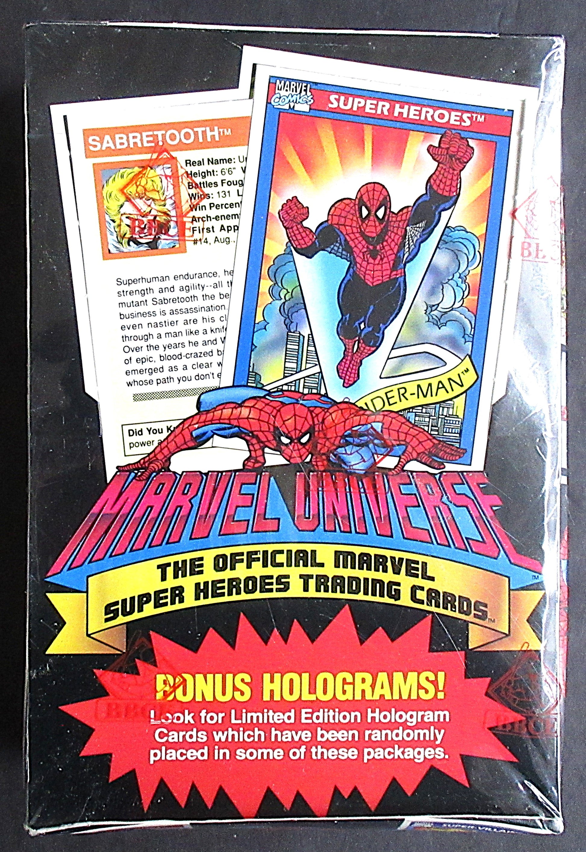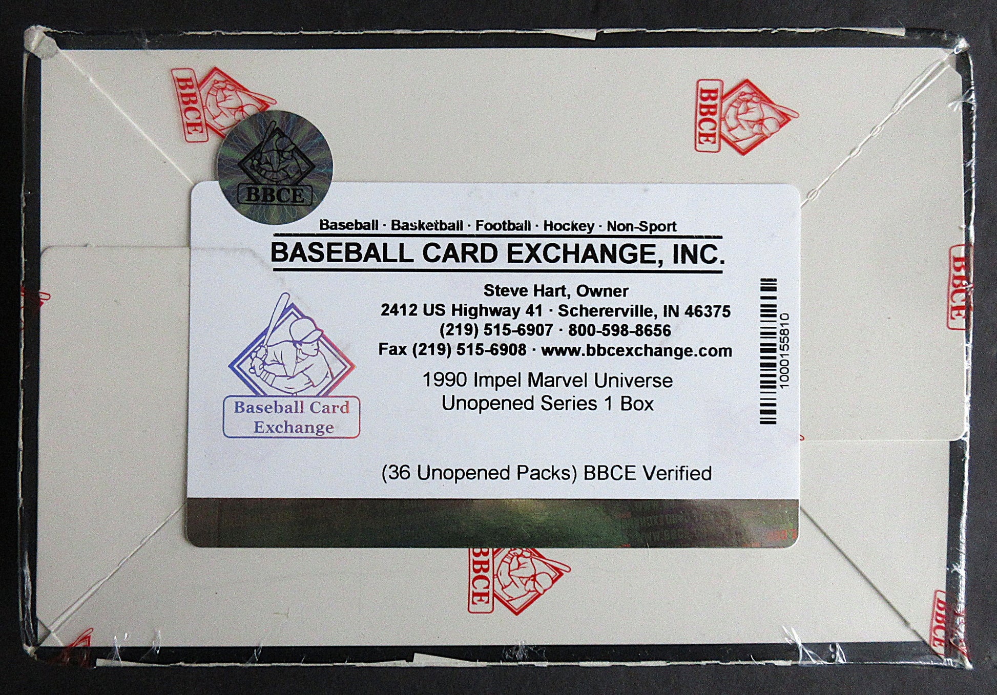1990 Impel Marvel Universe Unopened Series 1 Box (BBCE). This box contains (36) packs, each with (12) cards. The box has been authenticated and wrapped in Baseball Card Exchange shrink wrap.