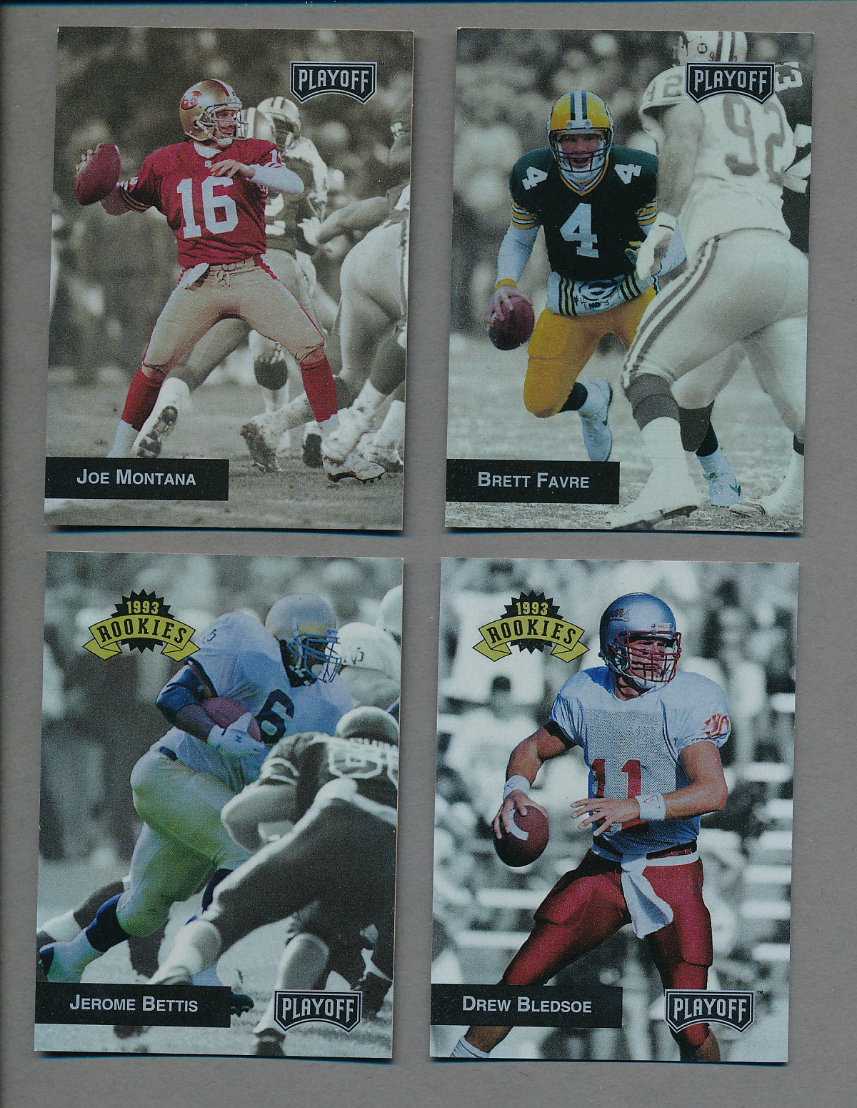 1993 Playoff Football Complete Set (w/ Inserts). This complete set contains (315) cards. The following insert sets are also included: Checklists (1-8), Brett Favre (1-5), Ricky Watters (1-5), Headliners Redemption (1-6), Playoff Club (1-7), Promo Inserts (1-6) and Rookie Roundup Redemption (1-10). The overall condition of this set averages NM/MT to MINT.