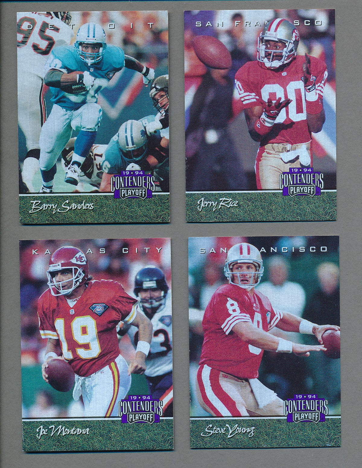1994 Playoff Contenders Football Complete Set (w/ Inserts). This complete set contains (120) cards. The following insert sets are also included: Throwbacks (1-30) and Rookie Contenders (1-6). The overall condition of this set averages NM/MT to MINT.