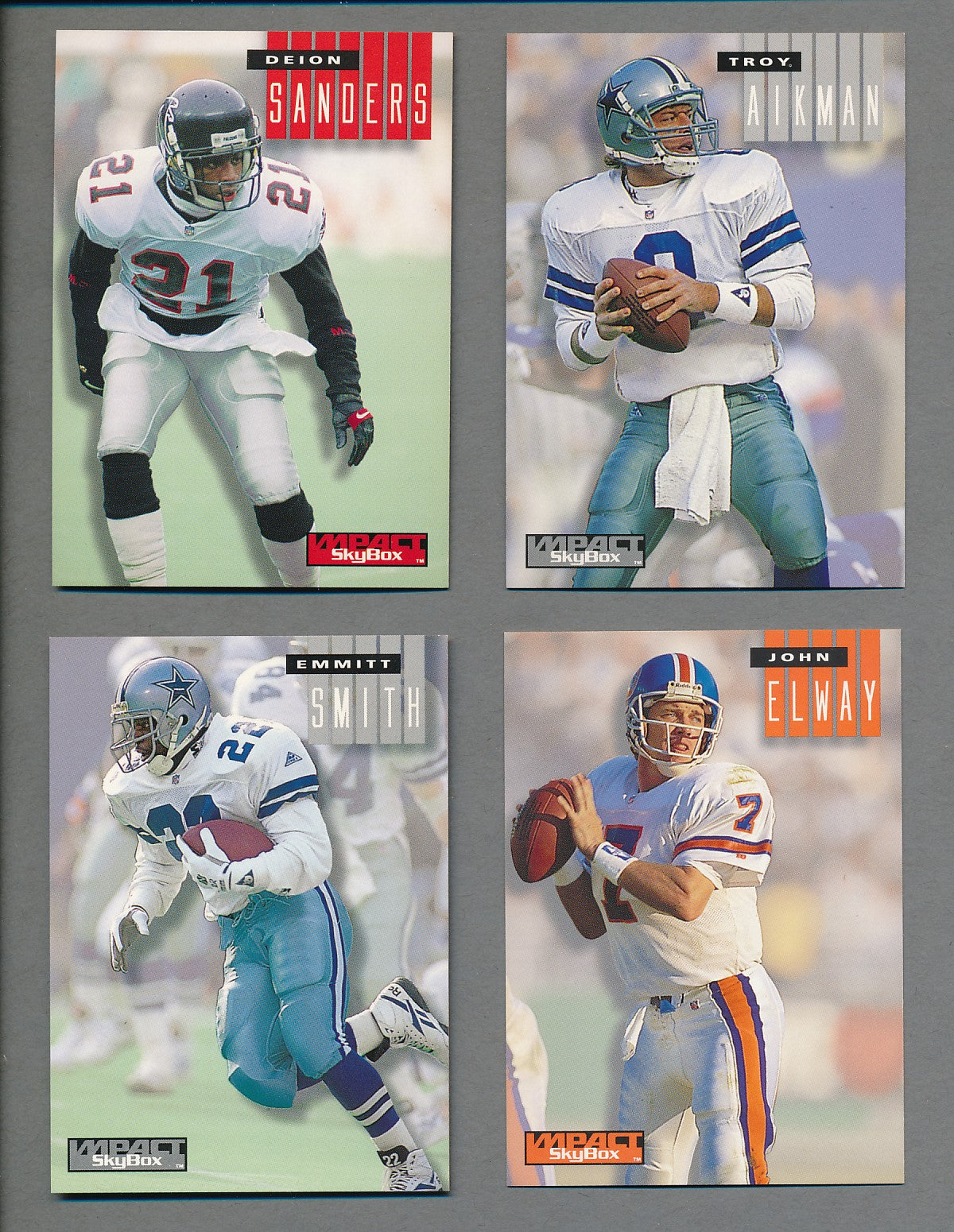 1994 Skybox Impact Football Complete Set (w/ Inserts). This complete set contains (300) cards. The following insert sets are also included: Instant Impact (1-12), Ultimate Impact (1-15), and Rookie Redemption (1-30). The overall condition of this set averages NM/MT to MINT.