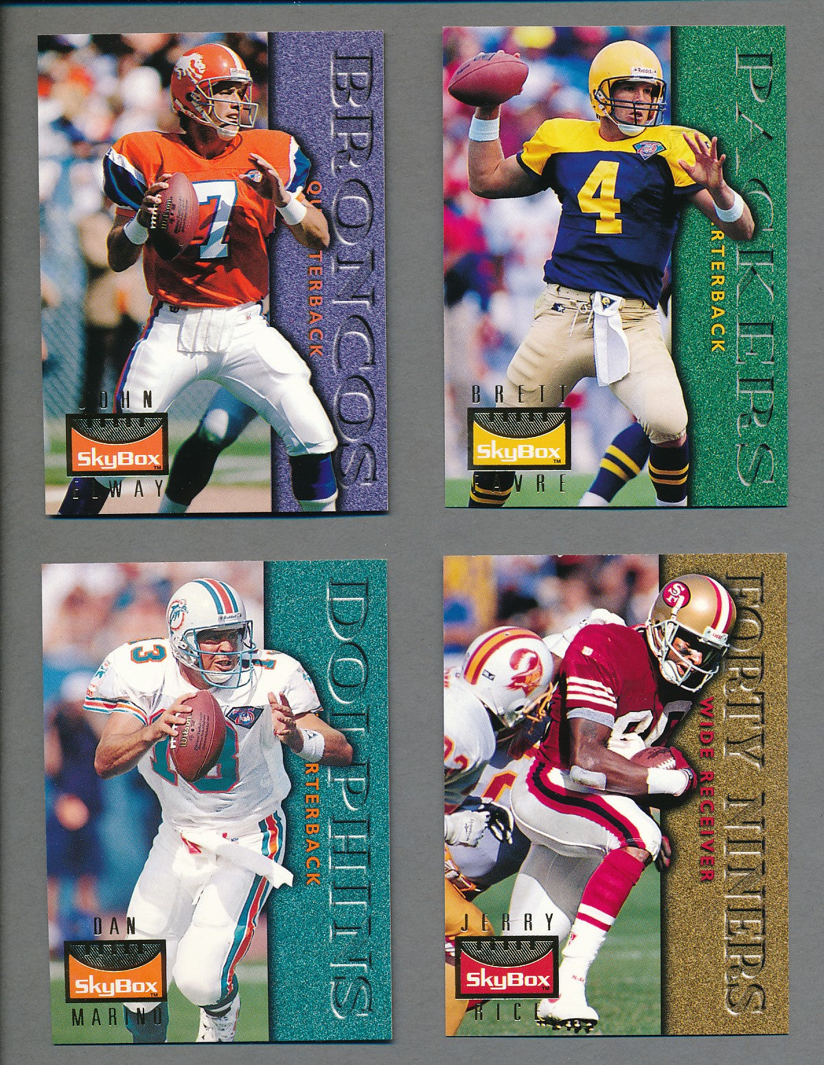 1995 Skybox Premium Football Complete Set (w/ Inserts). This complete set contains (200) cards. The following insert sets are also included: Quickstrike (1-10), Promise (1-14), Paydirt Gold (1-30) and Prime Time Rookies (1-10). The overall condition of this set averages NM/MT to MINT.
