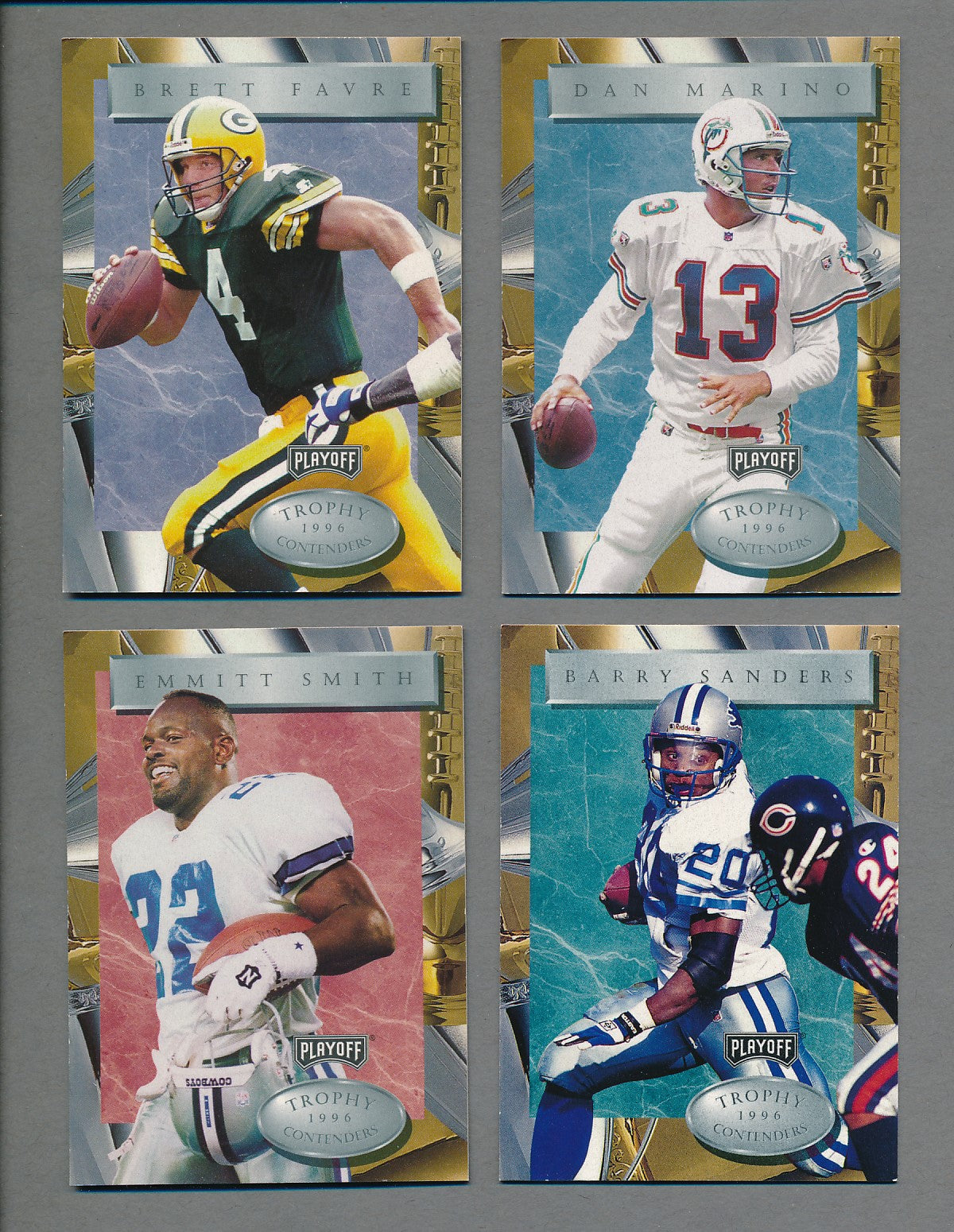 1996 Playoff Trophy Contenders Football Complete Set. This complete set contains (120) cards. The overall condition of this set averages NM/MT to MINT.