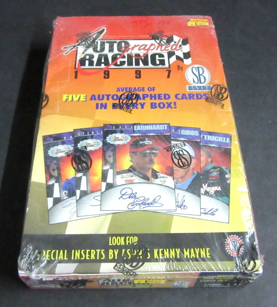 1997 Score Board Autographed Racing Race Cards Box. This box contains (24) packs, each with (5) cards. This box has an average of (5) autographed cards.