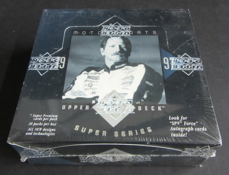 1997 Upper Deck SP Motorsports Super Series Racing Race Cards Box. Box contains 20 packs, each pack with 7 cards.