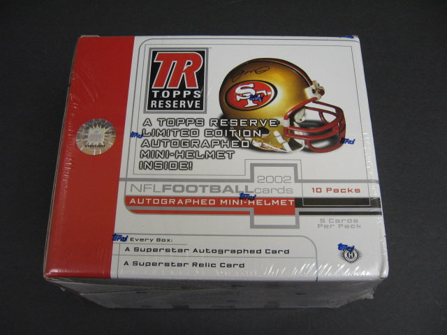 2002 Topps Reserve Football Box (Hobby). This Hobby box contains (10) packs, each with (5) cards. Each box contains an Autographed Mini-Helmet. Also look for (1) Superstar Autographed card and (1) Superstar Relic card per box (on average).