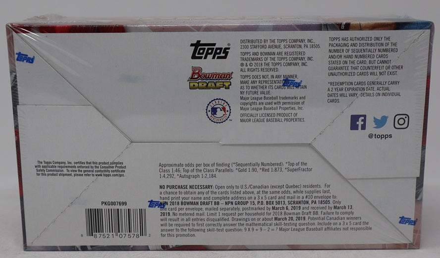 2018 Bowman Draft Baseball Jumbo Box (Hobby) (12/32). This Hobby box contains (12) Jumbo packs, each with (32) cards. Look for (3) Autograph cards per box (on average).