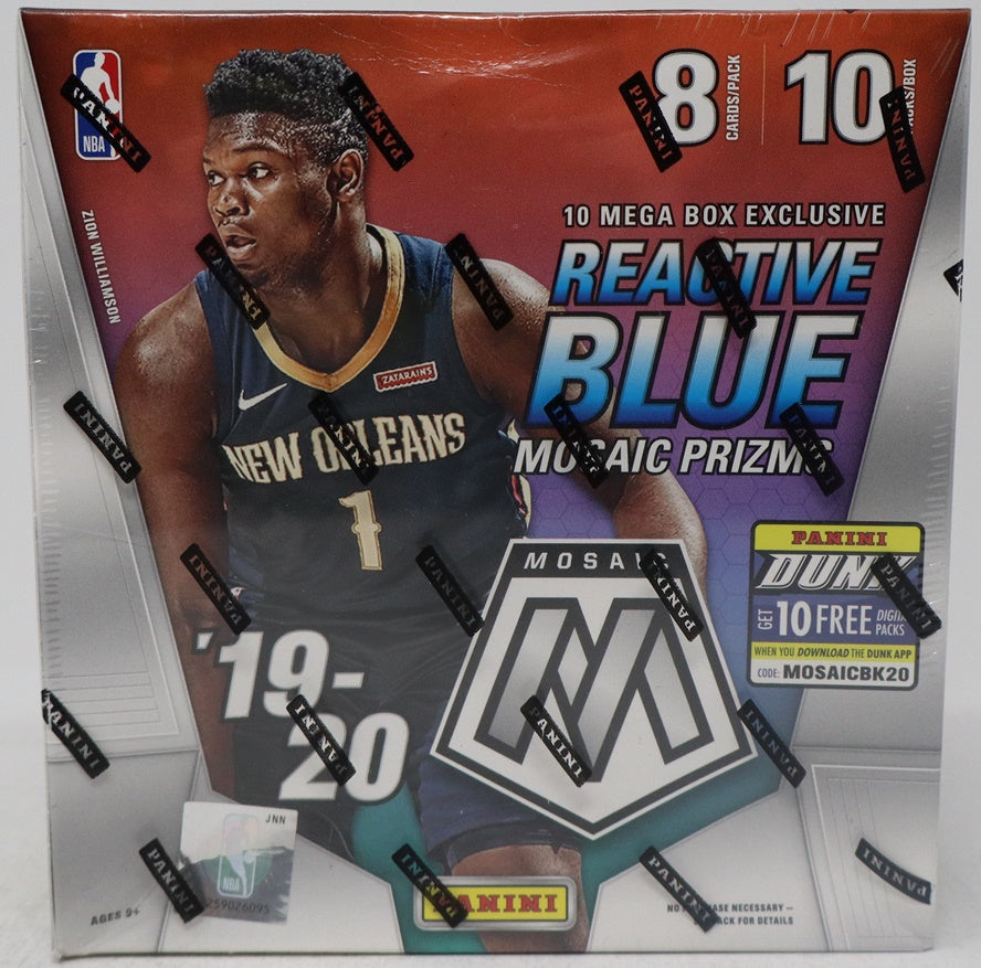 2019/20 Panini Mosaic Basketball Mega Box (10/8). This Mega Box contains (10) packs, each with (8) cards (including (10) Reactive Blue Prizms).