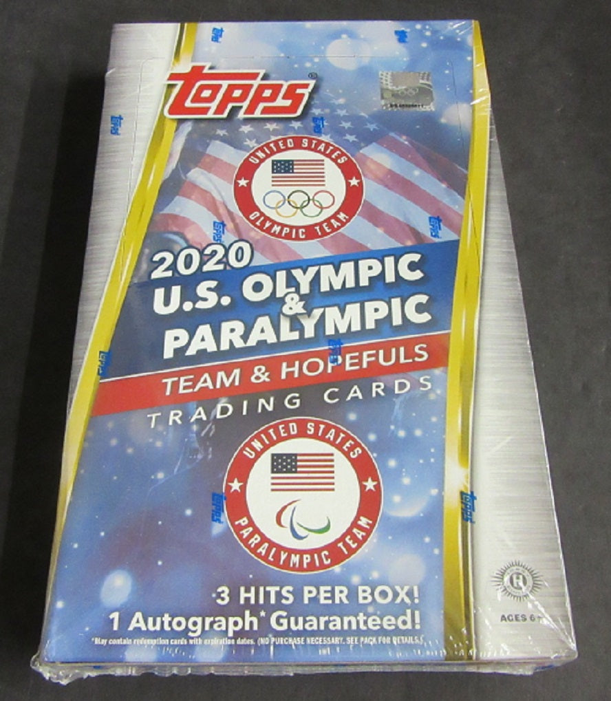 2020 Topps U.S. Olympic & Paralympic Trading Card Box (Hobby) (24/8). This box contains (24) packs, each with (8) cards. Each box has (3) hits with (1) Autograph per box(on average).