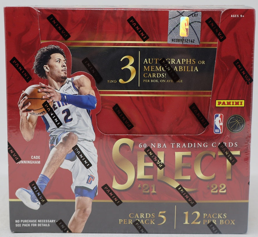 2021/22 Panini Select Basketball Box (Hobby) (12/5). This Hobby box contains (12) packs, each with (5) cards. Each box contains (3) Autograph or Memorabilia cards (on average).