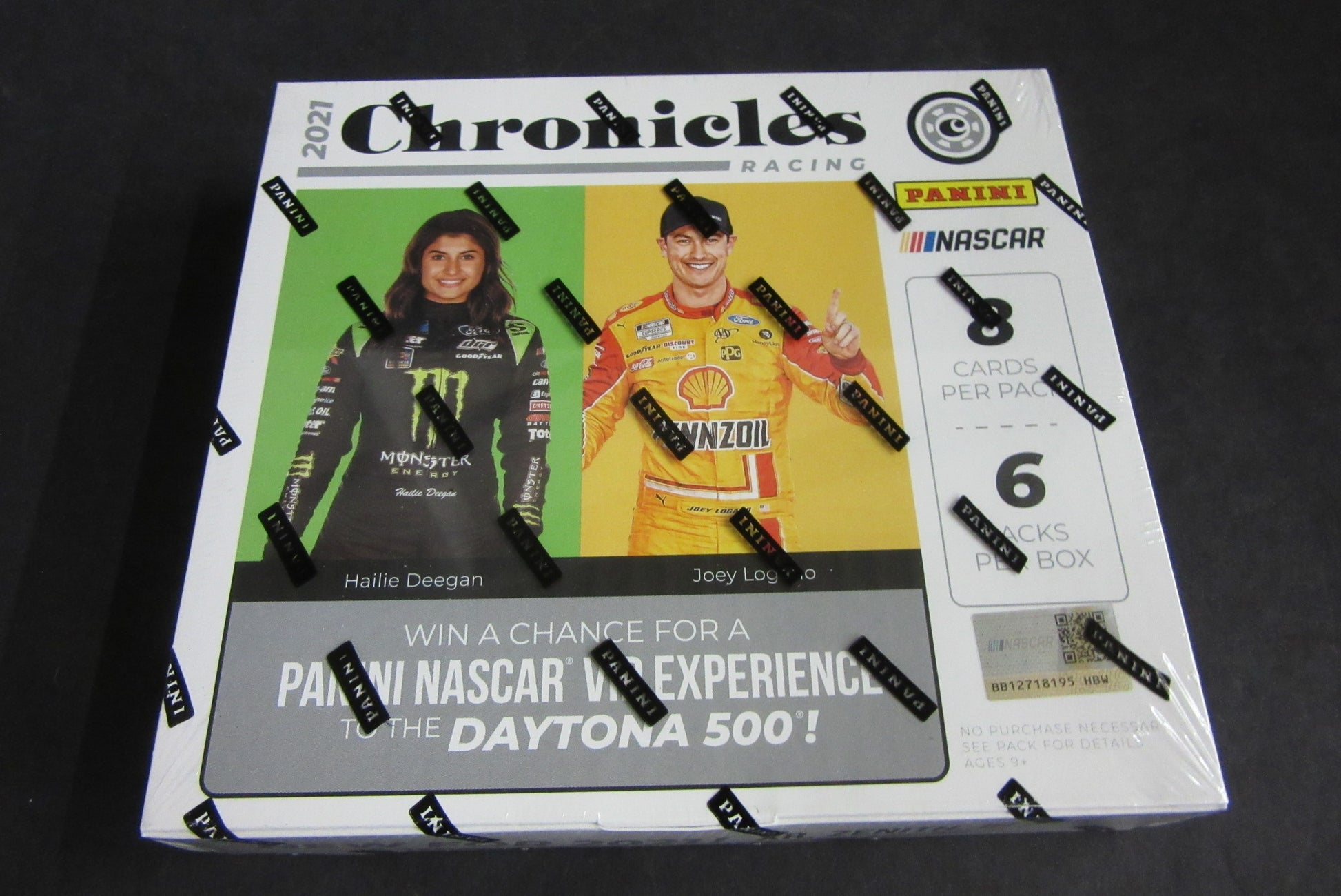 2021 Panini Chronicles Nascar Racing Trading Cards Box (Hobby). This box contains (8) packs, each with (6) cards. Find (4) autographs or memorabilia cards per box.