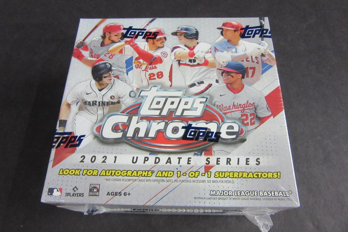 2021 Topps Chrome Baseball Update Series Mega Box (10/4). This Mega Box includes (10) packs, each with (4) cards.