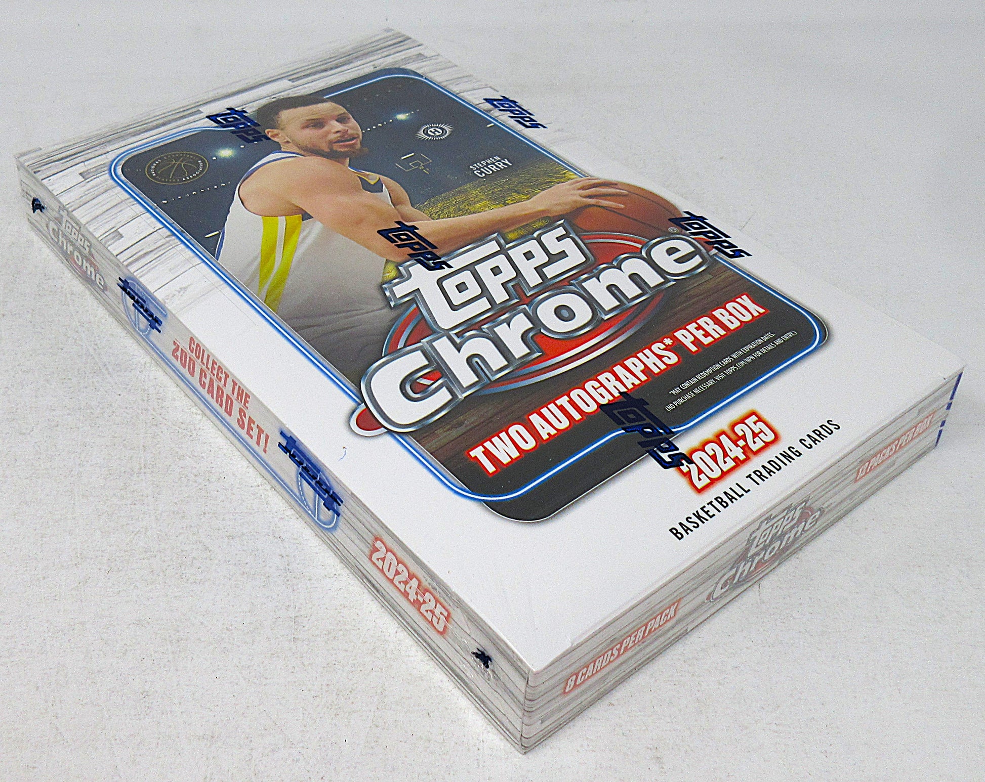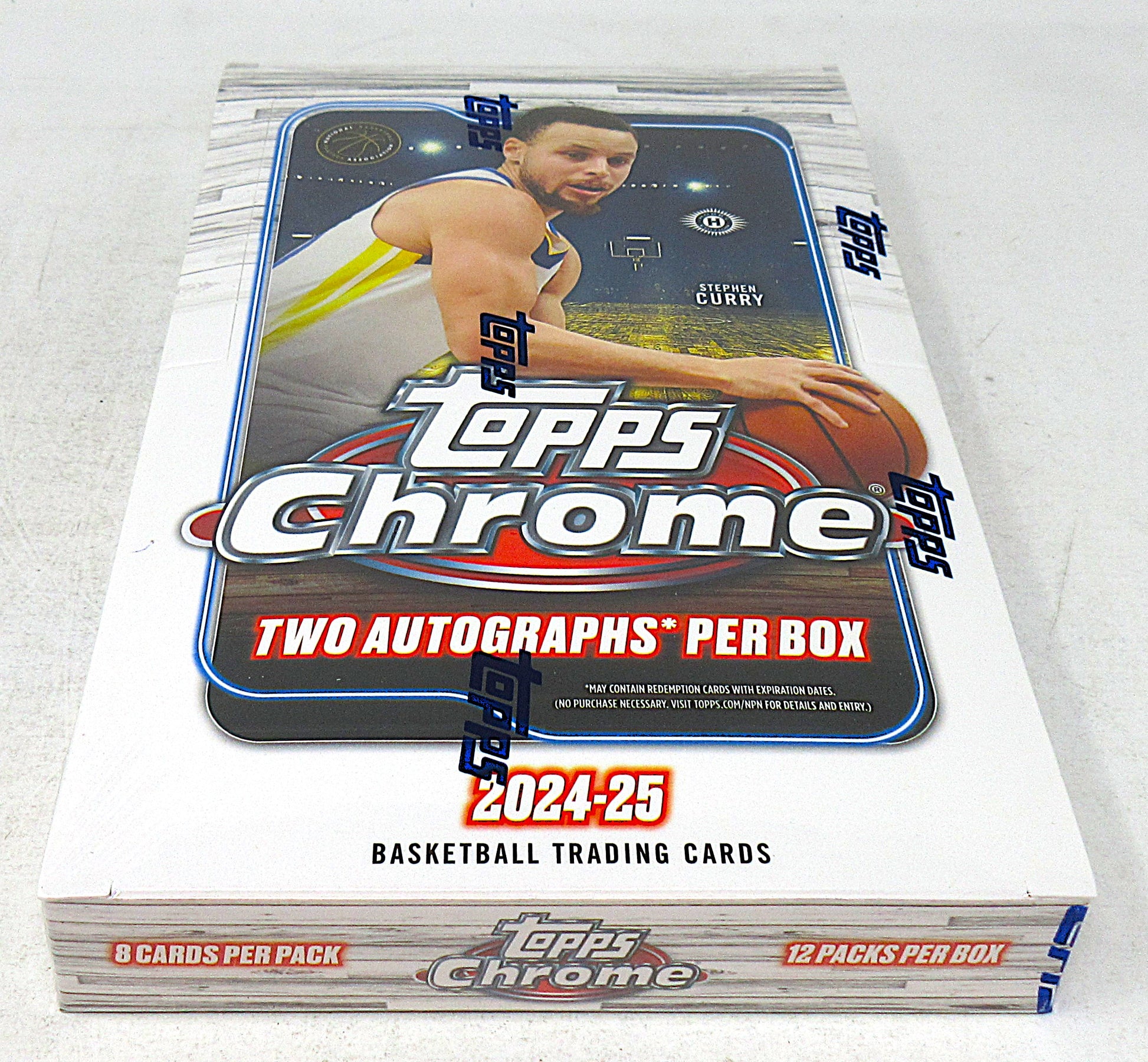 2024/25 Topps Chrome Basketball Box (Hobby) (12/8). This Hobby box contains (12) packs, each with (8) cards. Look for (2) Autographs per box (on average).