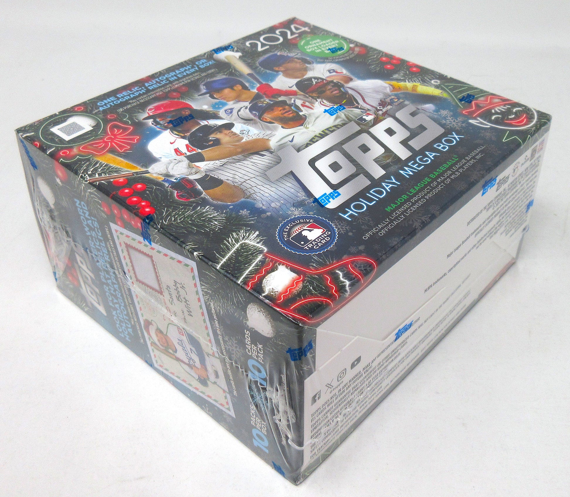 2024 Topps Baseball Mega Box (Holiday) (10/10). This Holiday box contains (1) packs, each with (10) cards. Look for (1) Relic, Autograph or Autograph Relic cards in every box (on average).