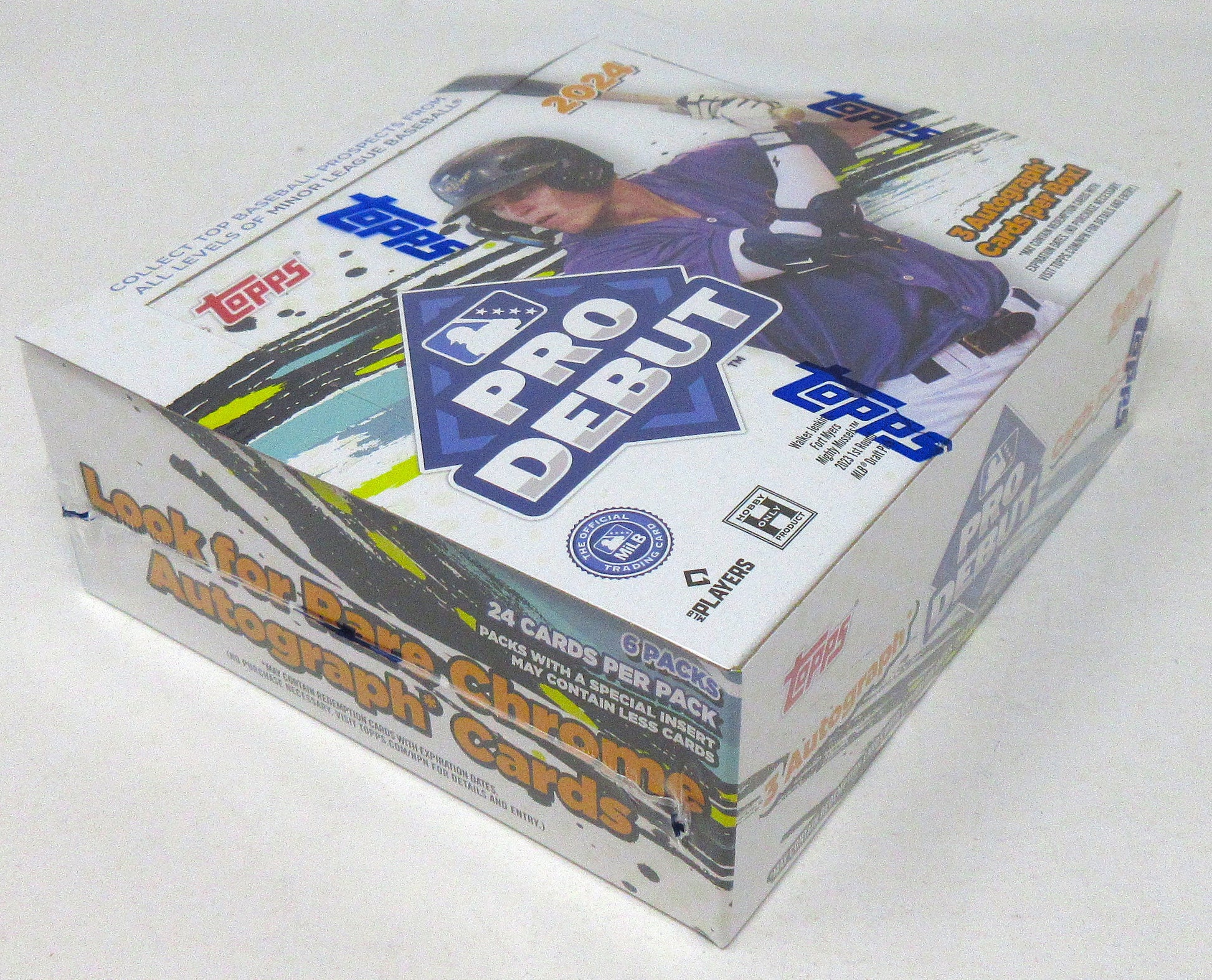 2024 Topps Pro Debut Baseball Jumbo Box (Hobby) (6/24). This Hobby box contains (6) Jumbo packs, each with (24) cards. Look for (3) Autograph cards per box (on average).