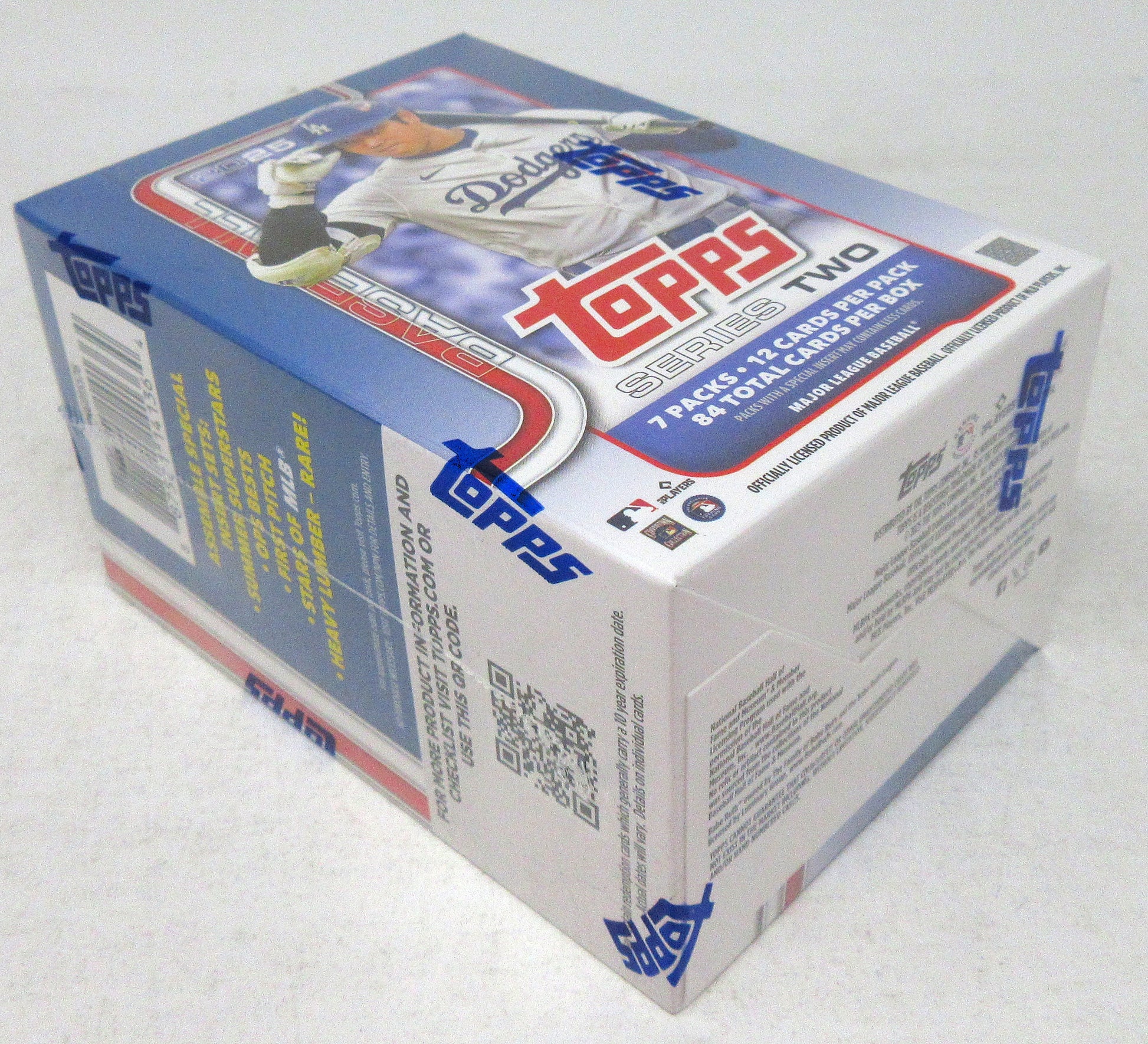 2025 Topps Baseball Series 2 Blaster Box (7/12). This Blaster box contains (7) packs, each with (12) cards. Look for (3) Blaster Box Holiday Base card parallels per box (on average).