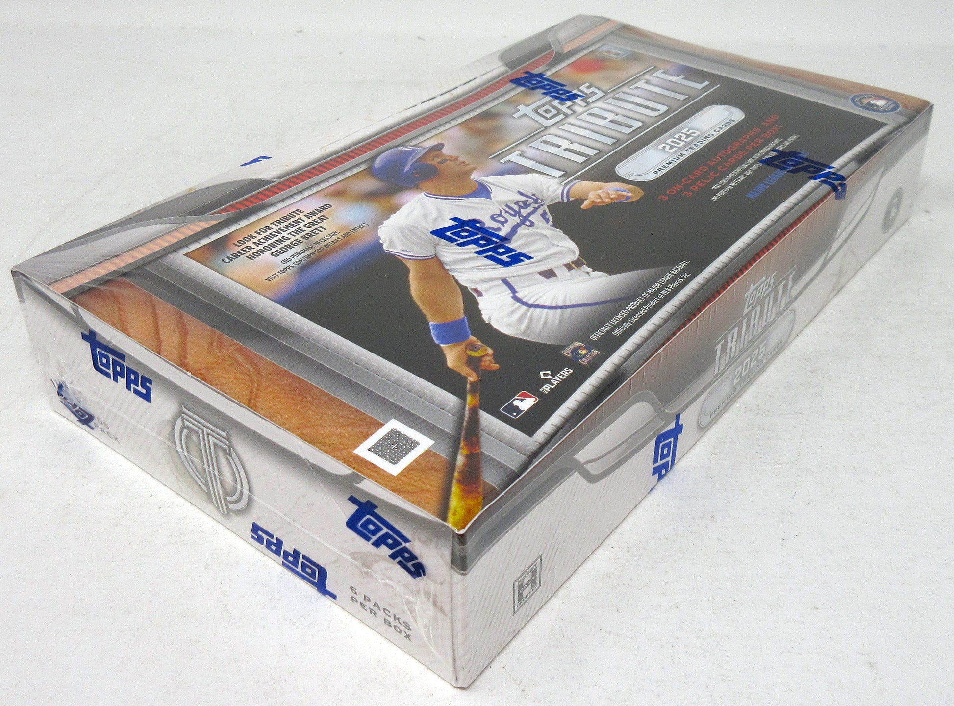 2025 Topps Tribute Baseball Box (Hobby) (6/3). This Hobby box contains (6) packs, each with (3) cards. Look for (3) Autograph cards and (3) Relic cards per box (on average).