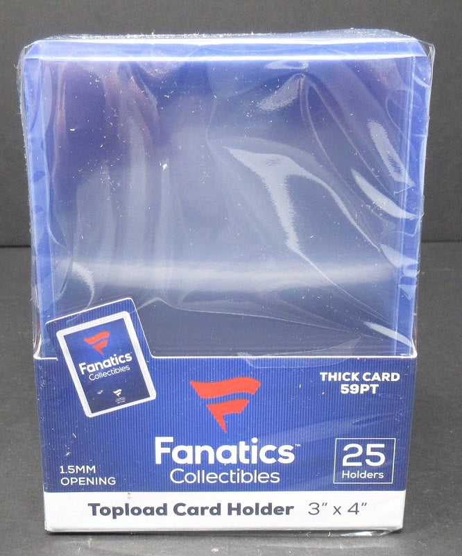 Fanatics Topload Card Holder Pack (3" x 4") (59 Point) (25 Count). These (59 Point) Topload card holders measure 3" x 4". The opening on these holders is 1.5 mm. This is a (25 Count) package.