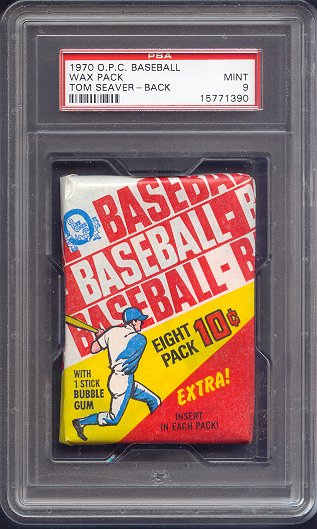 1970 OPC Baseball Unopened Wax Pack w/Seaver Back PSA 9. Has Tom Seaver showing on the back of the pack!