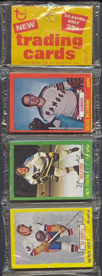 1973/74 Topps Hockey Unopened Rack Pack. Each rack pack contains (54) cards. This rack pack has been authenticated and wrapped in Baseball Card Exchange shrink wrap. We use stock photos for our listings and all packs are pulled at random.