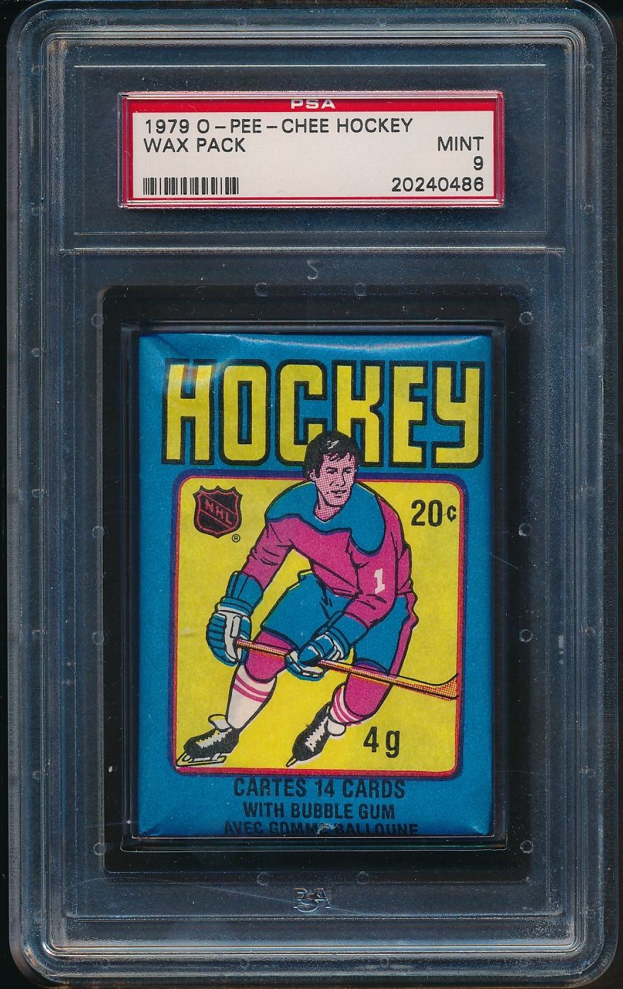 1979/80 OPC Hockey Unopened Wax Pack PSA 9 (Torn) *0486. Pack has some tears in the wrapper from the shifting gum.