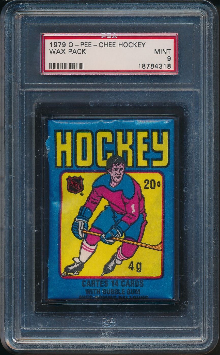 1979/80 OPC Hockey Unopened Wax Pack PSA 9 (Torn) *4318. Pack has some tears in the wrapper from the shifting gum.