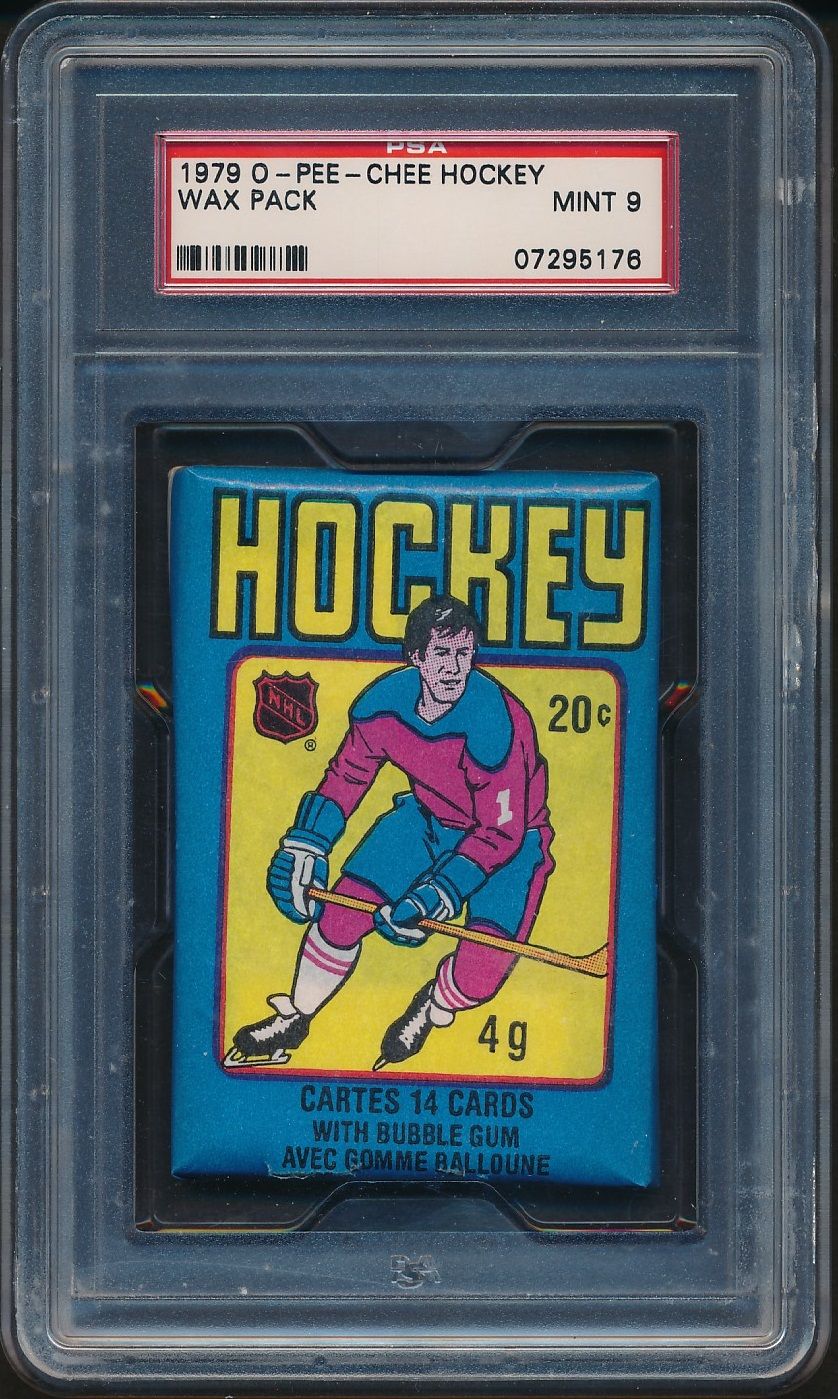 1979/80 OPC Hockey Unopened Wax Pack PSA 9 (Torn) *5176. Pack has some tears in the wrapper from the shifting gum.
