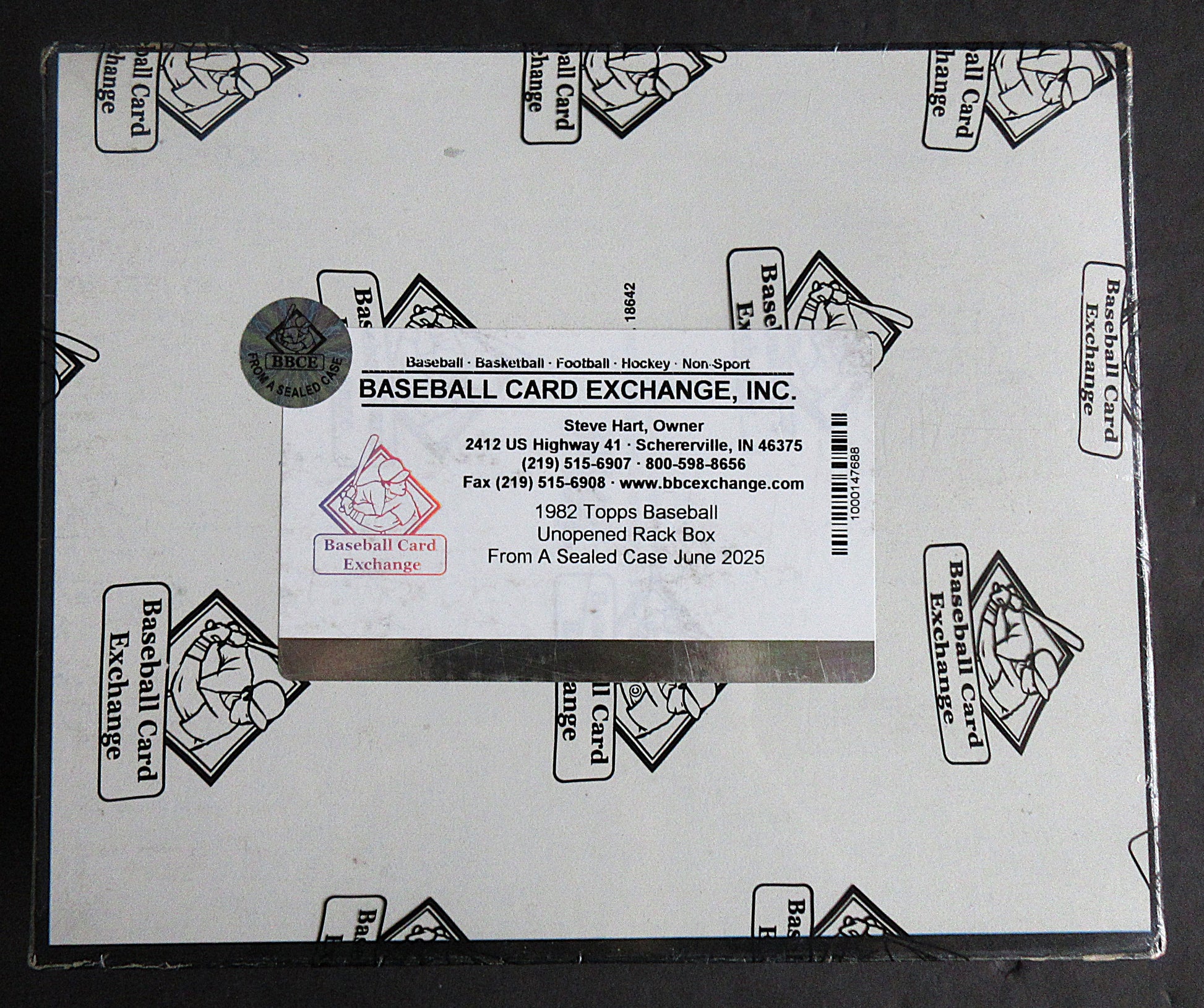 1982 Topps Baseball Unopened Rack Box (FASC). This box contains (24) rack packs, each with (51) cards. The box has been authenticated as "From A Sealed Case" and wrapped in Baseball Card Exchange shrink wrap.