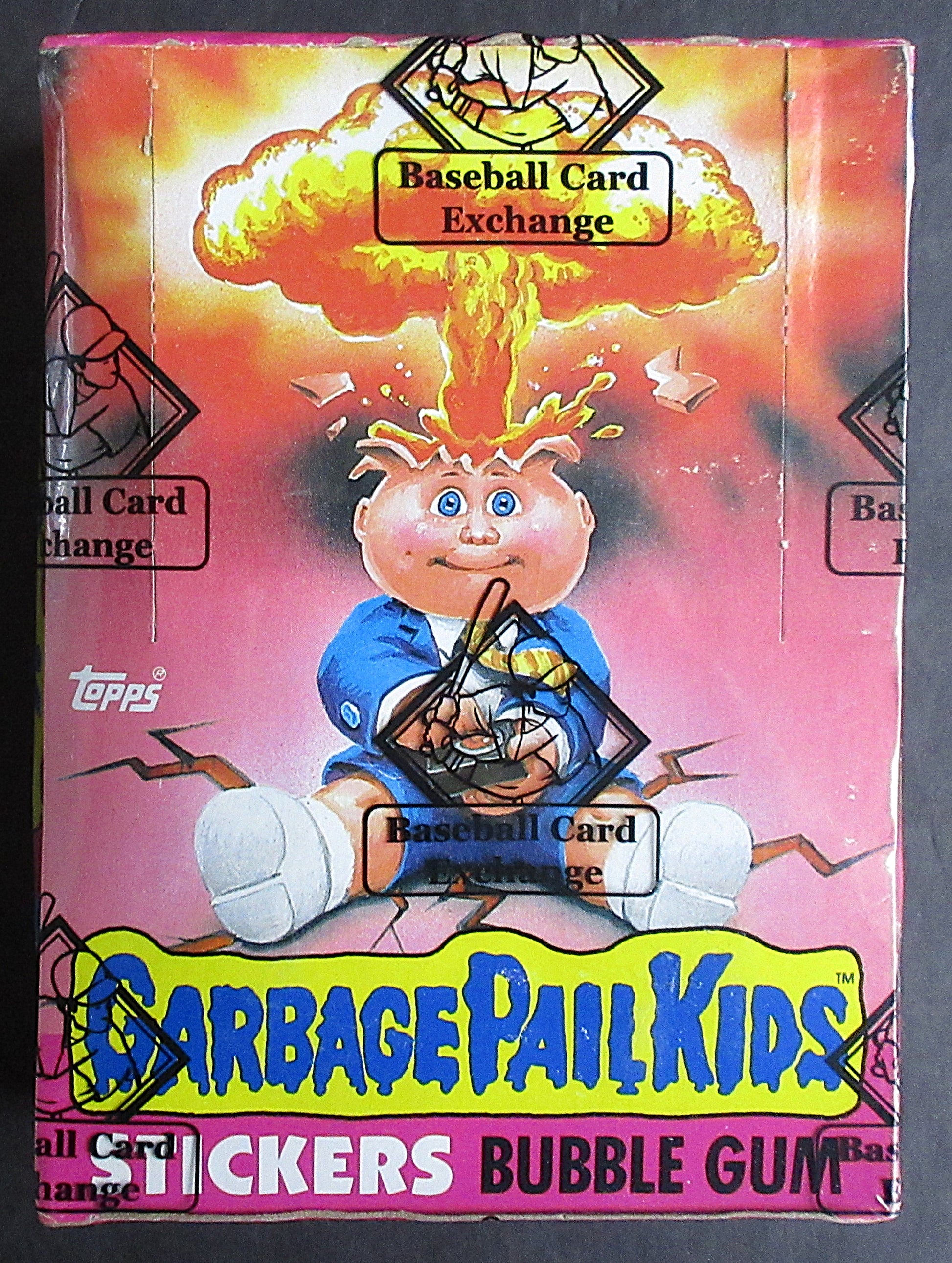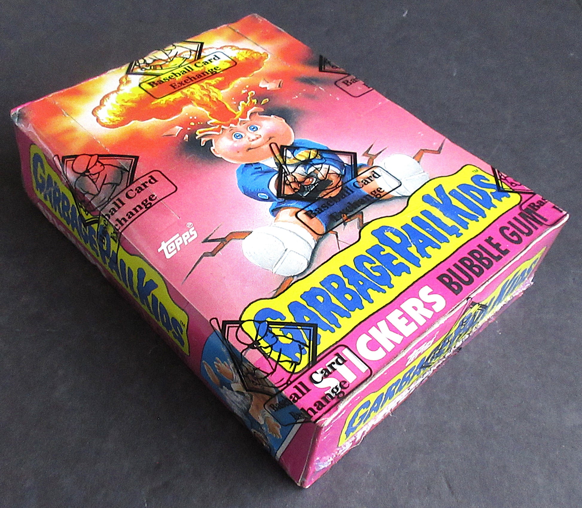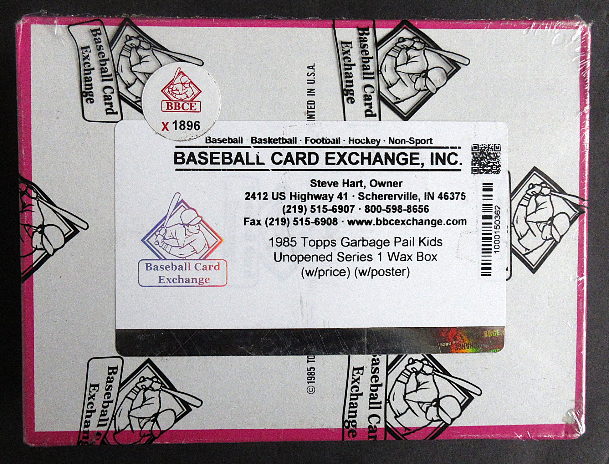 1985 Topps Garbage Pail Kids Series 1 Unopened Wax Box (w/ price) (w/ poster) (BBCE) (X1896). This box contains (48) unopened (w/ price) variation packs. This box also includes the advertising poster. This box has been authenticated and wrapped in Baseball Card Exchange shrink wrap.