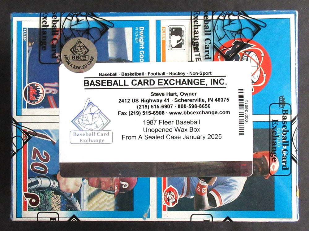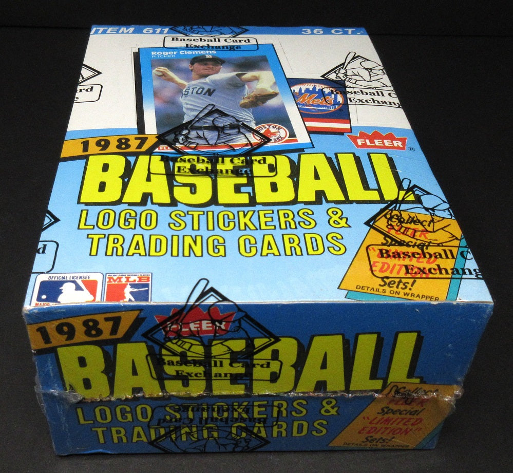 1987 Fleer Baseball Unopened Wax Box (FASC). This box contains (36) packs, each with (17) cards and (1) sticker.  The box has been authenticated as From A Sealed Case and wrapped in Baseball Card Exchange shrink wrap.