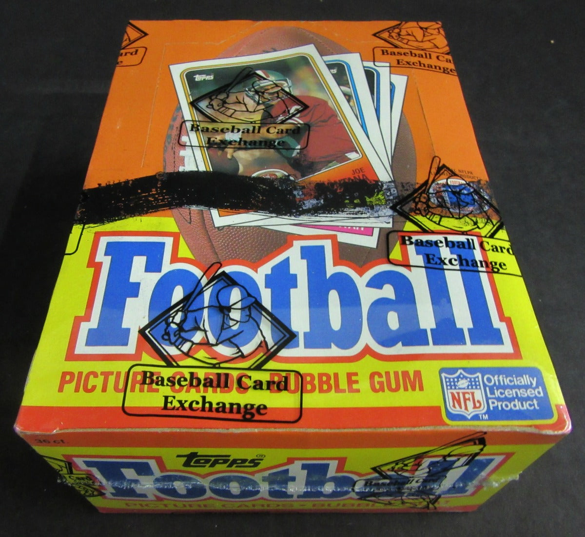 1988 Topps Football Unopened Wax Box (BBCE) (X-Out). This box contains (36) packs, each with (15) cards and (1) glossy card. The box has been authenticated and wrapped in Baseball Card Exchange shrink wrap. This is an "X-Out" box. Please read our blog post on "The History of the X-Out" for more information on these boxes.