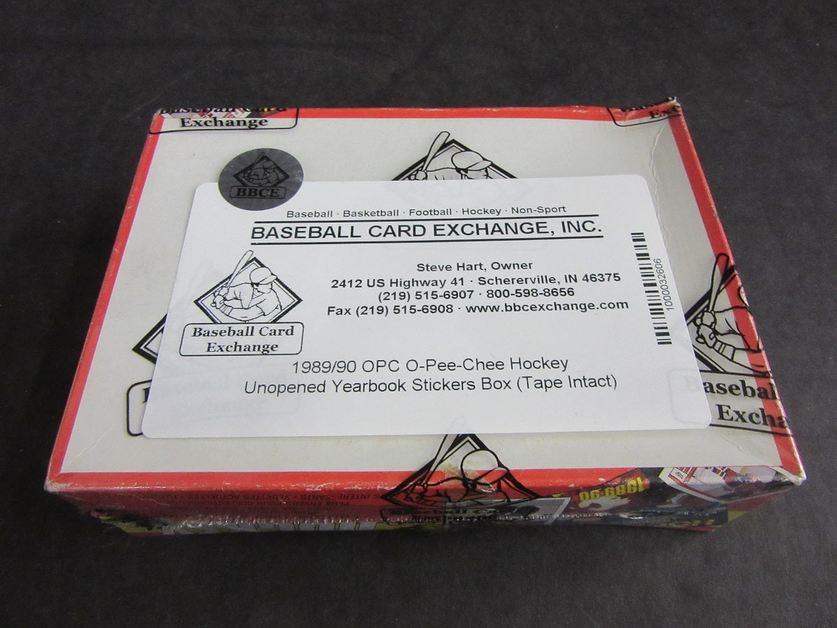 1989/90 OPC O-Pee-Chee Hockey Stickers Unopened Box (Tape) (BBCE). This box contains (48) unopened packs. The box has been authenticated as Tape Intact and wrapped in Baseball Card Exchange shrink wrap.