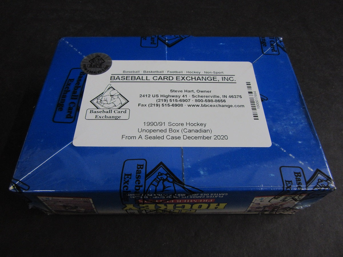 1990/91 Score Hockey Unopened Box (Canadian) (FASC). This box contains (36) packs. The box has been authenticated as From A Sealed Case and wrapped in Baseball Card Exchange shrink wrap.