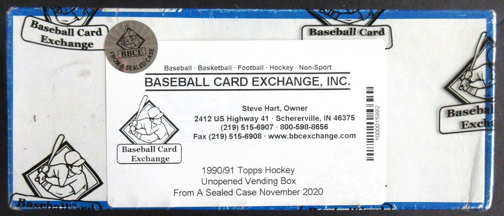 1990/91 Topps Hockey Unopened Vending Box (FASC). This vending box contains (500) cards (approximately). Each box has been authenticated as "From A Sealed Case" and wrapped in Baseball Card Exchange shrink wrap.