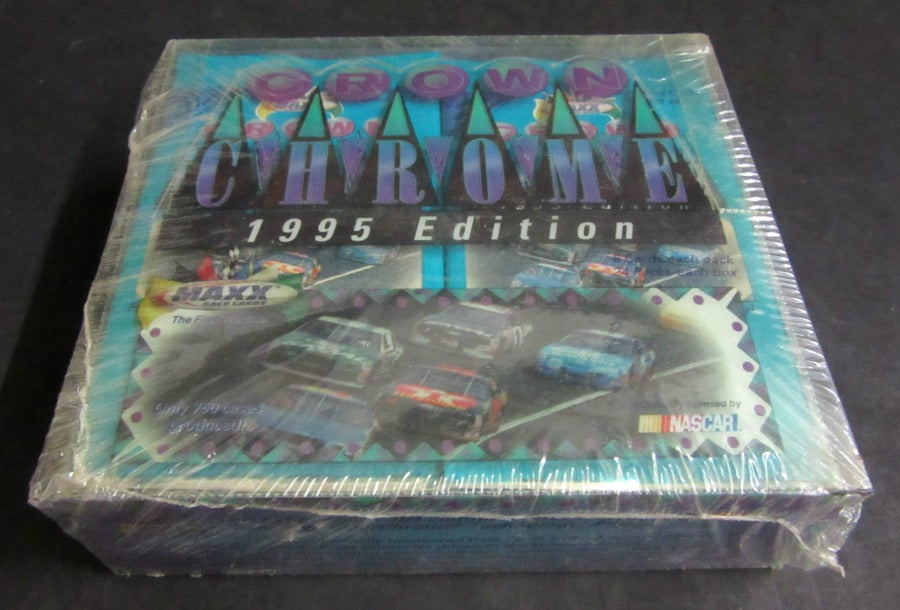 1995 Maxx Crown Chrome Racing Race Cards Box. This box contains (24) unopened packs, each with (6) cards per pack. The original shrink wrap was very brittle and fell off. We wrapped the box in clear shrink wrap.