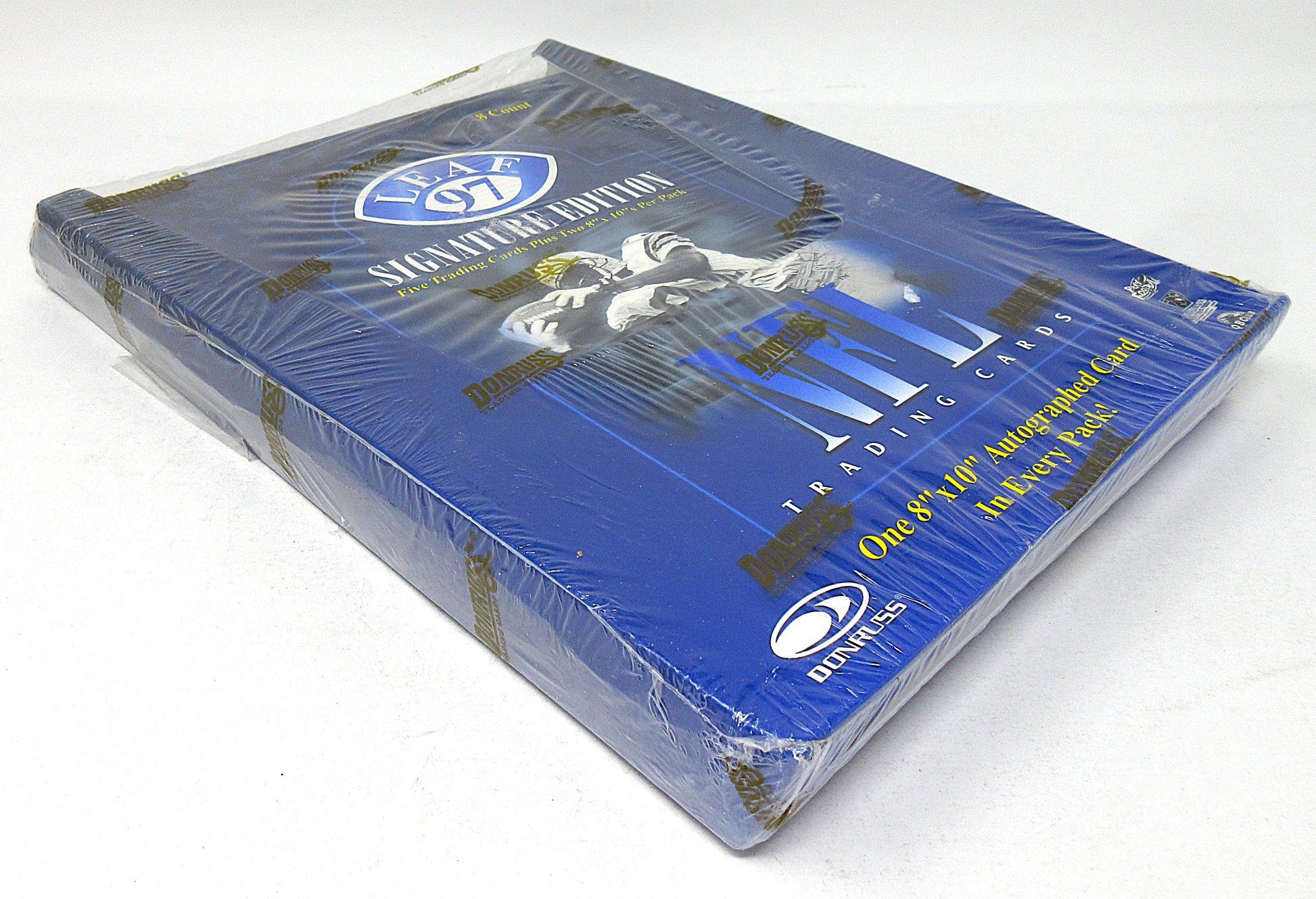 1997 Leaf Signature Edition Football Box (8x10). This box includes (8) packs. Each pack includes (5) trading cards and (2) 8x10 cards. In each pack (1) of the 8x10 cards will be autographed.