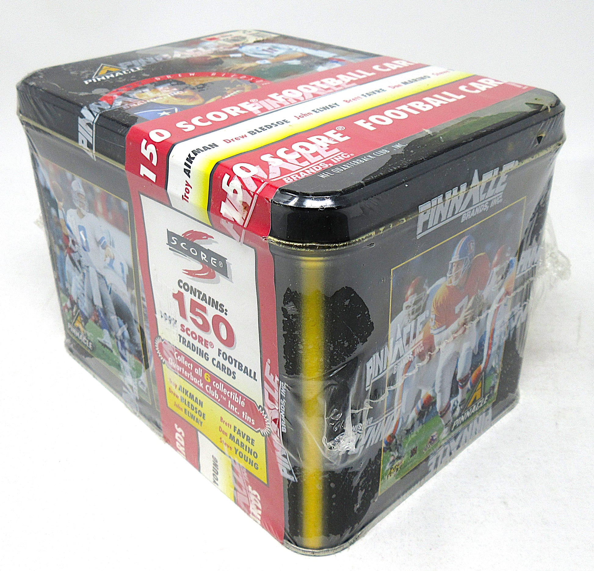 1997 Score Football Box (Tin) (150). This box contains (150) 1997 Score Football Trading cards in a collectible Quarterback Club Tin.
