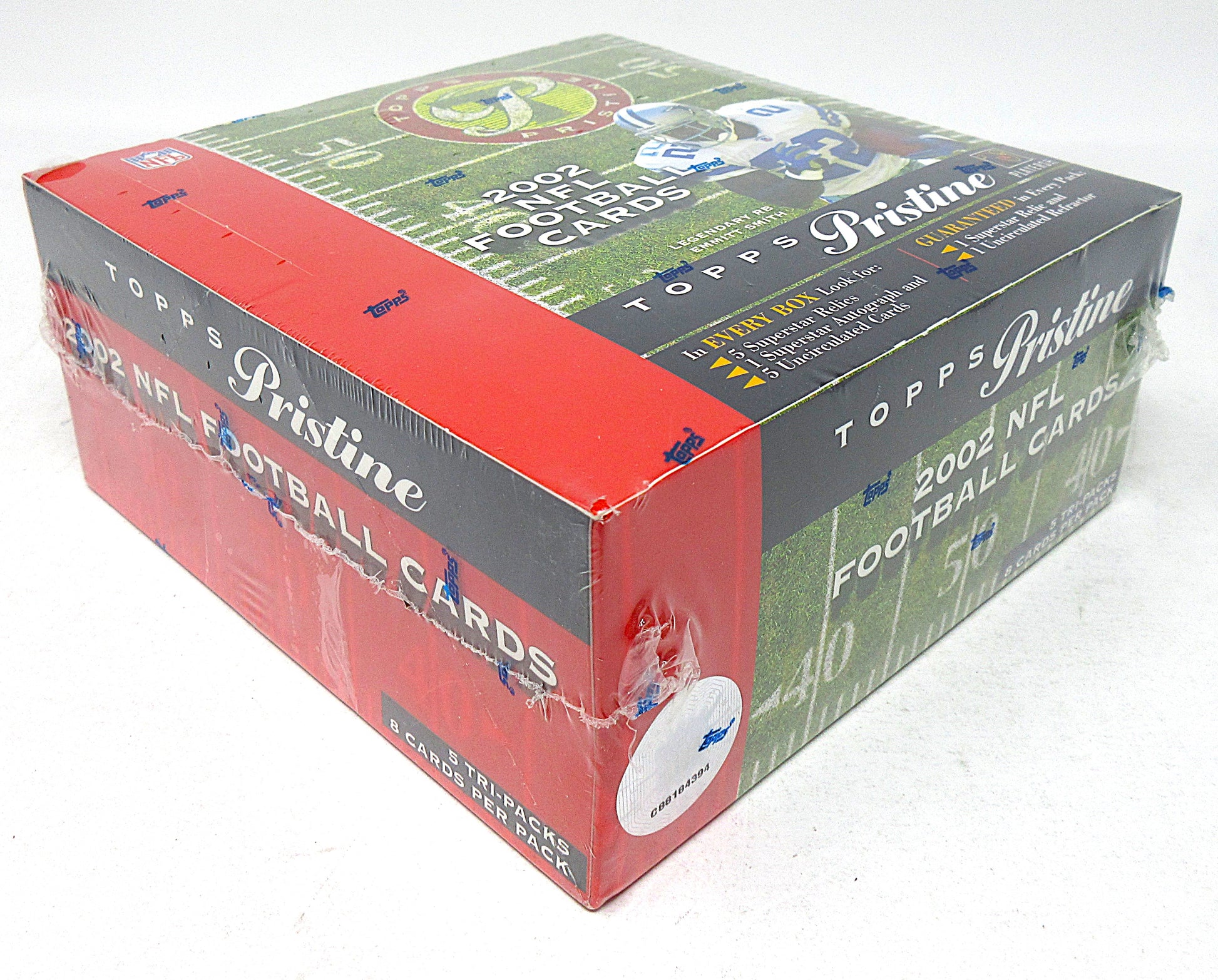 2002 Topps Pristine Football Box (Hobby). This Hobby box contains (5) Tri-Packs, each with (8) cards.  In every box look for (5) Superstar Relics, (1) Superstar Autograph and (5) Uncirculated Cards.