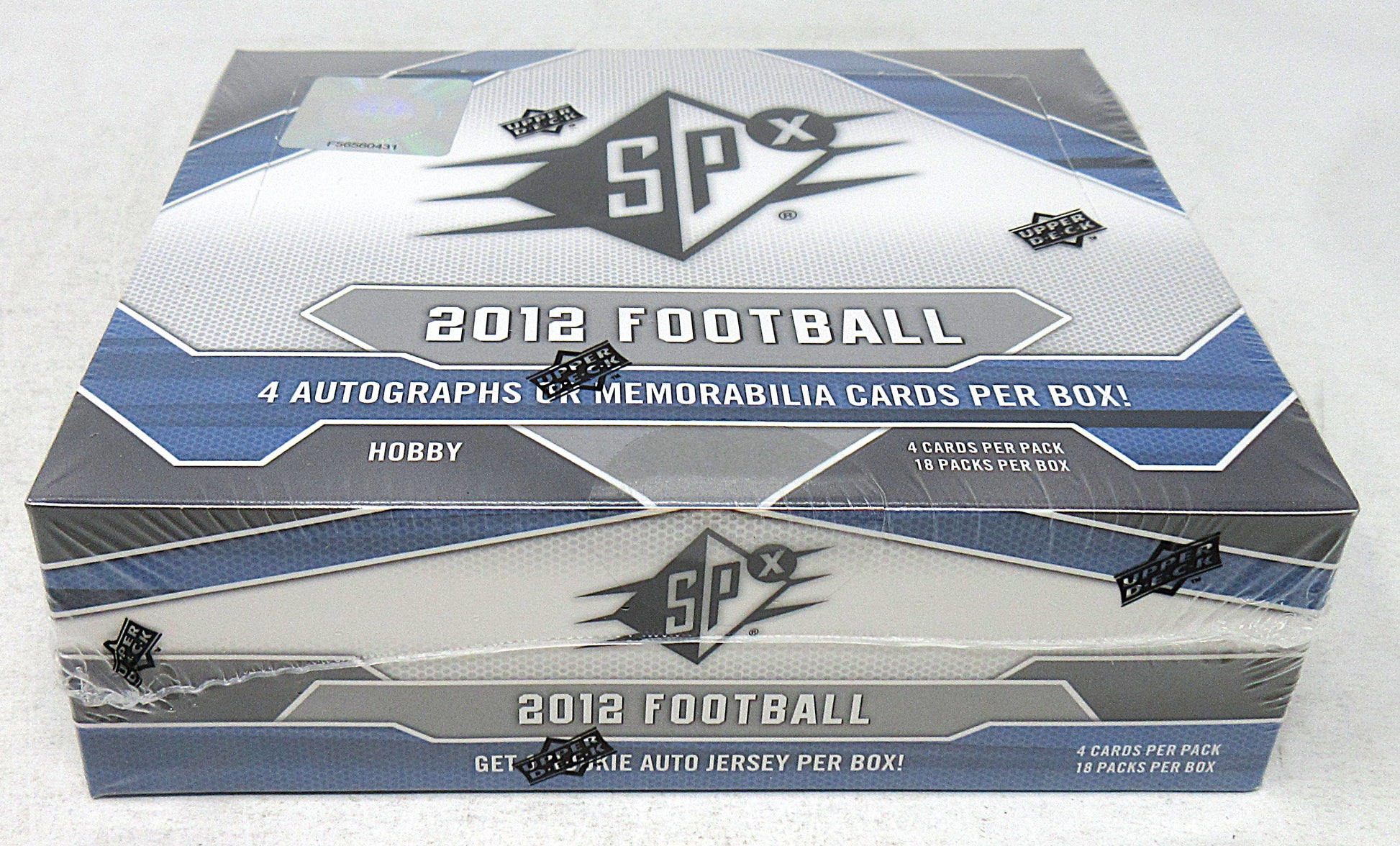 2012 Upper Deck SPX Football Box (Hobby) (18/4). This box contains (18) packs, each with (4) cards. Each box contains (4) Autographs or Memorabilia cards (on average).