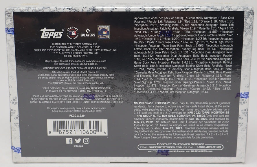 2022 Topps Inception Baseball Box (Hobby) (7 Cards). This box contains (7) cards, including (1) Autograph or Autograph Relic Card and (2) Base Card Parallels.